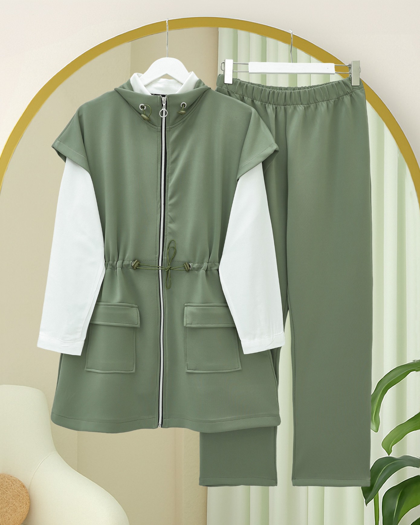 Çift Cepli Fermuarlı Lastik Detaylı Kısakollu Scuba Takım -Çağla Y.-Çağla Y.