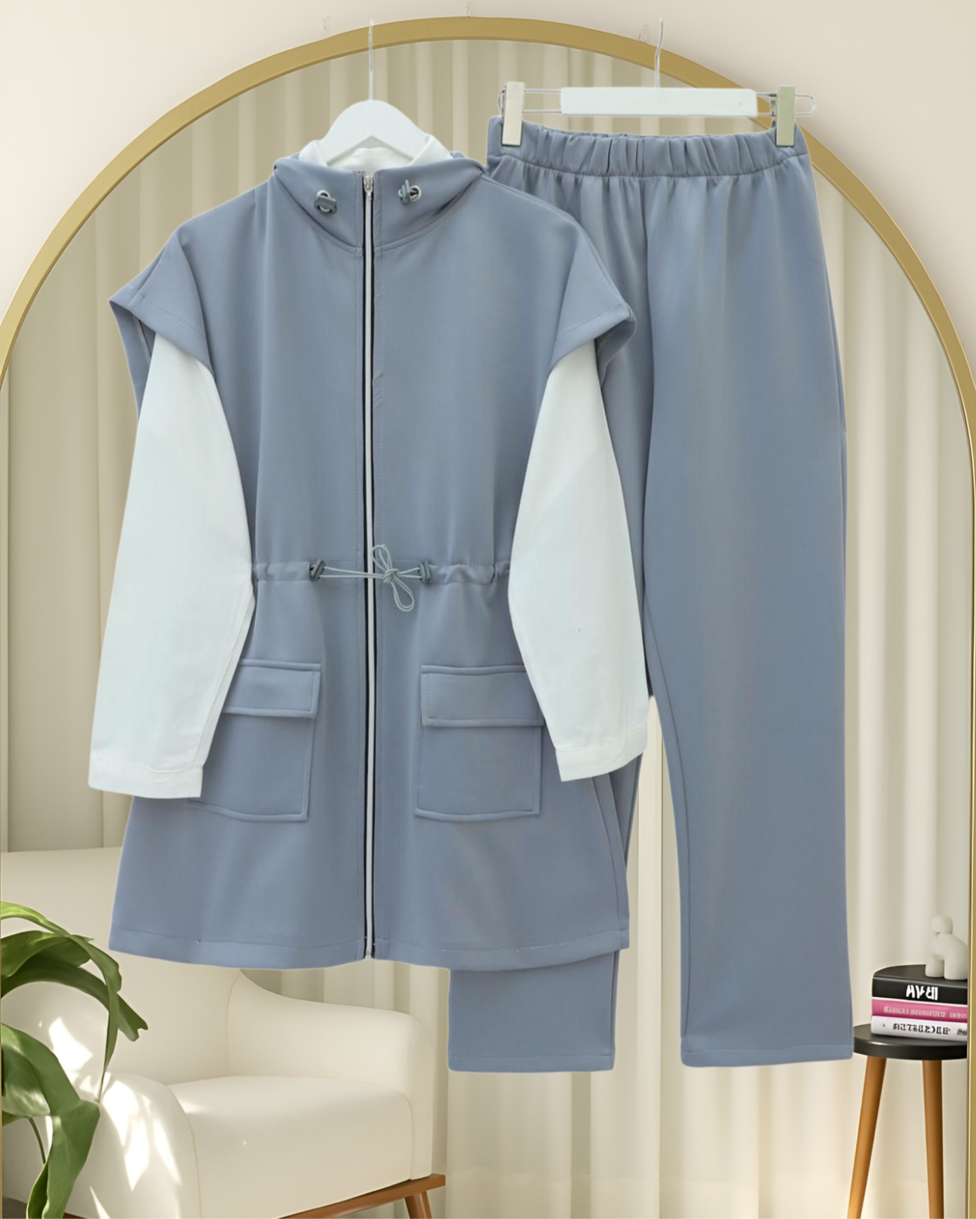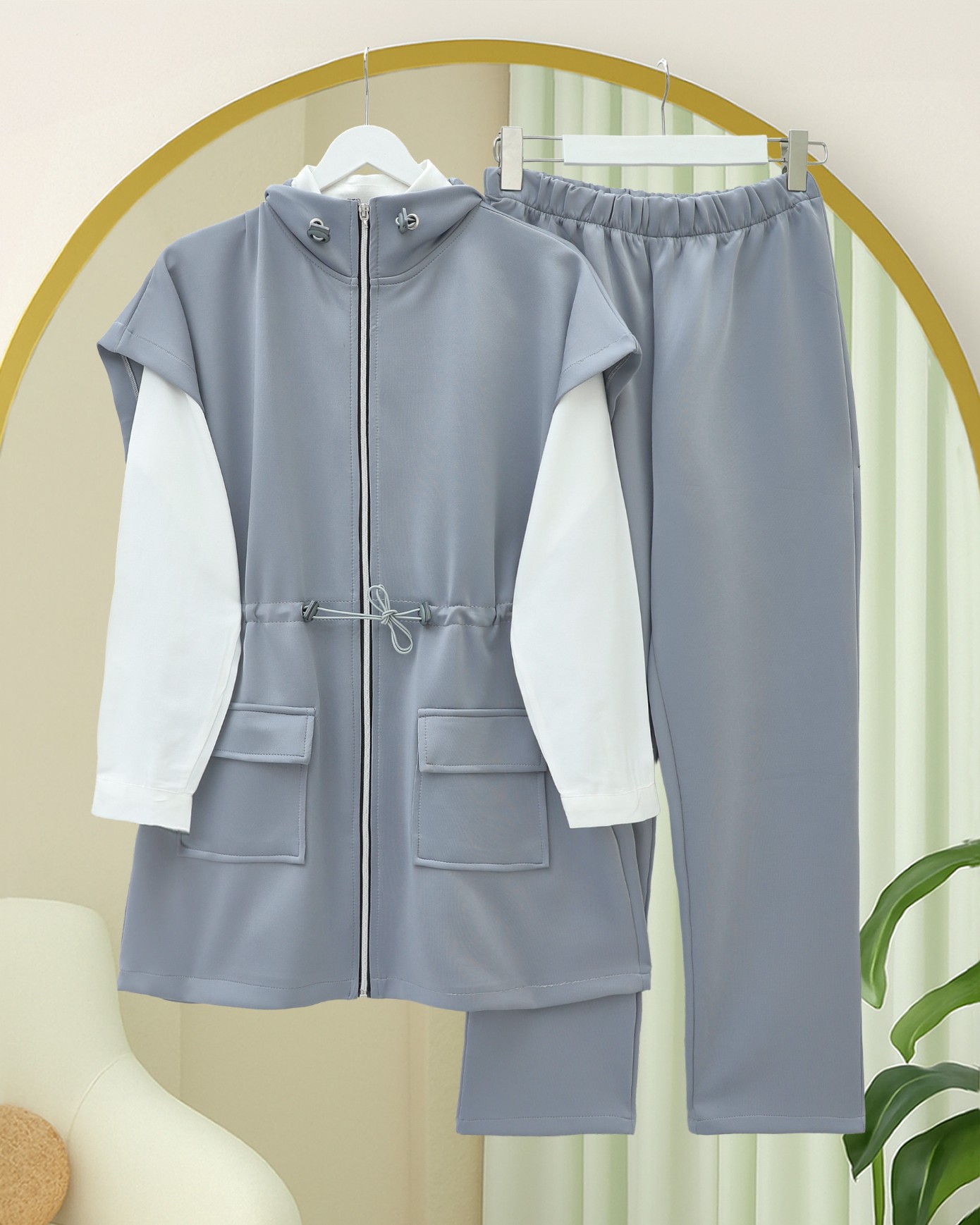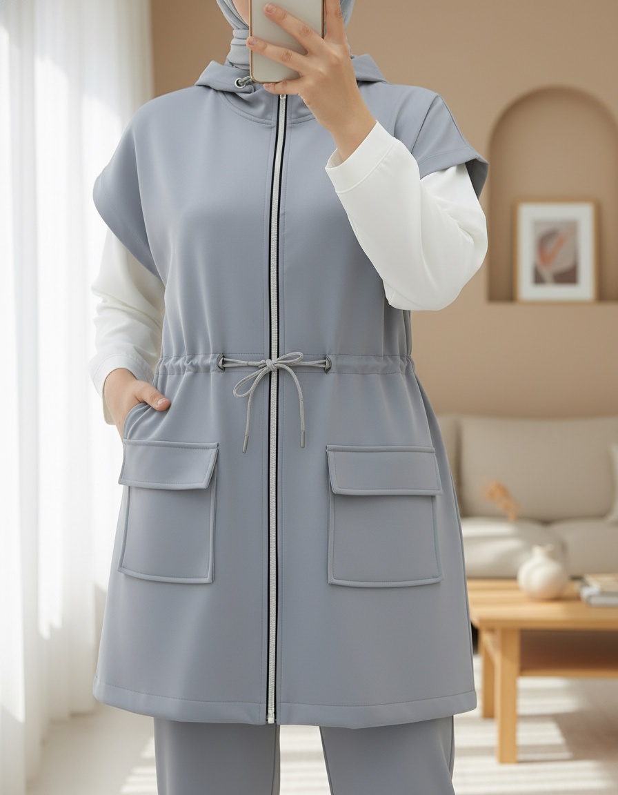 Çift Cepli Fermuarlı Lastik Detaylı Kısakollu Scuba Takım -Gri-Gri