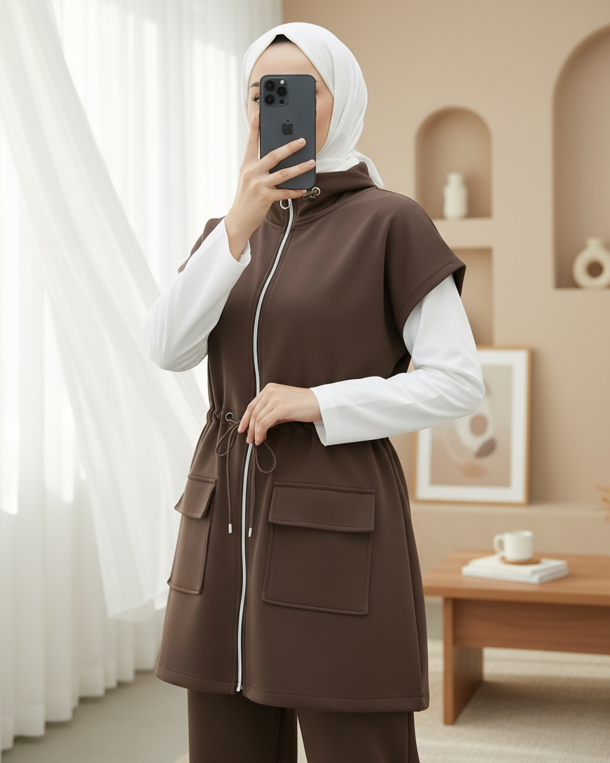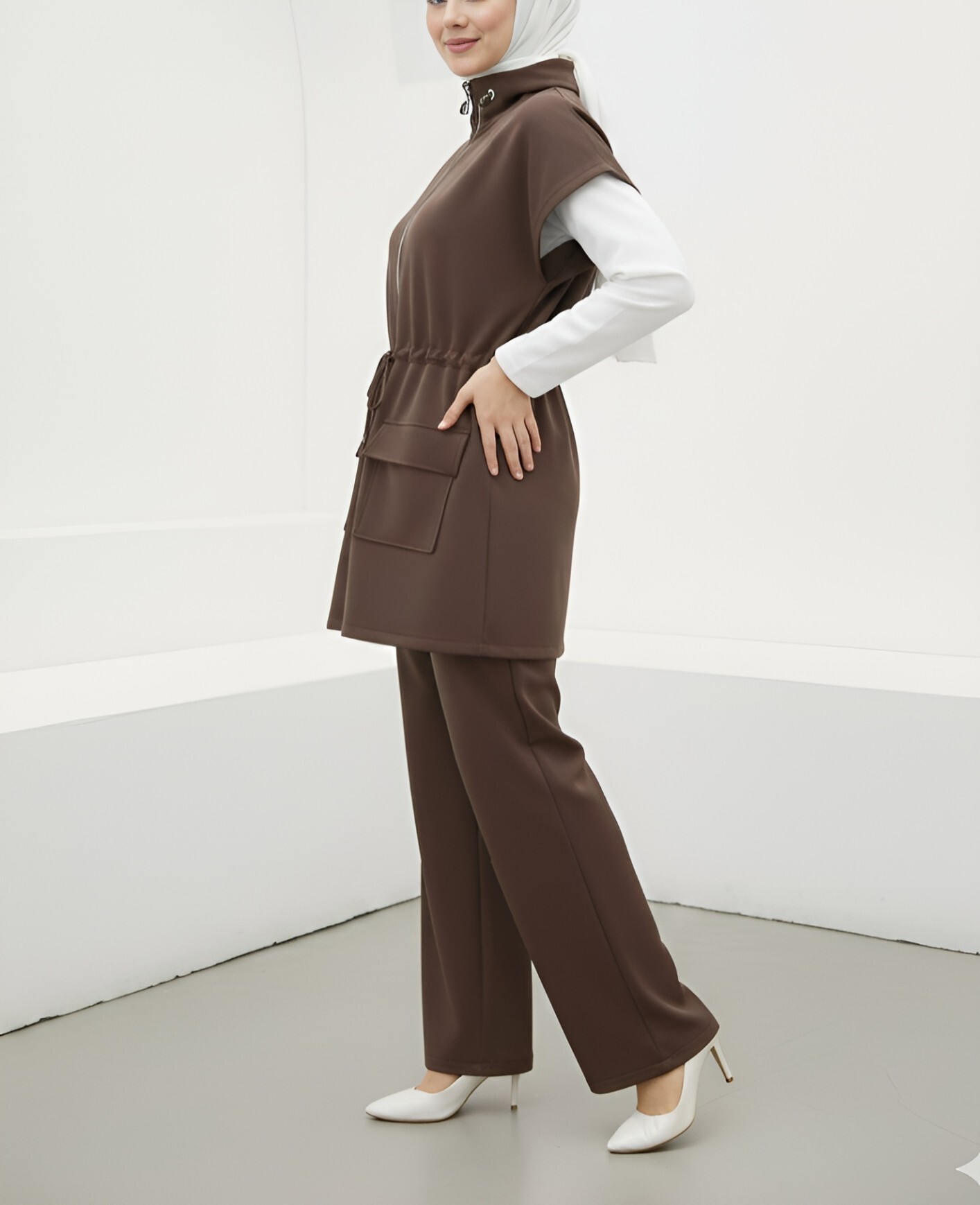 Çift Cepli Fermuarlı Lastik Detaylı Kısakollu Scuba Takım -Kahve-Kahve