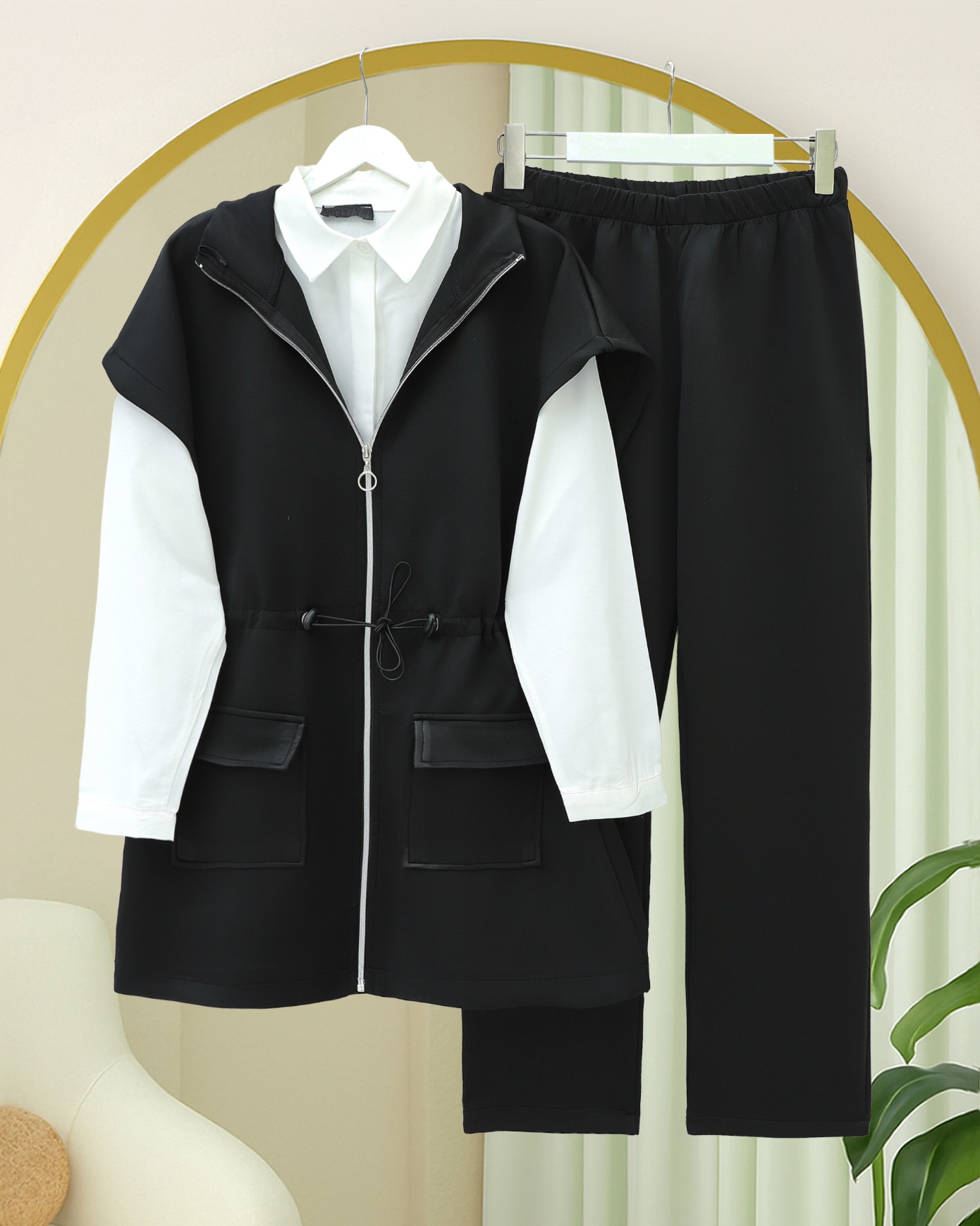 Çift Cepli Fermuarlı Lastik Detaylı Kısakollu Scuba Takım -Siyah-siyah