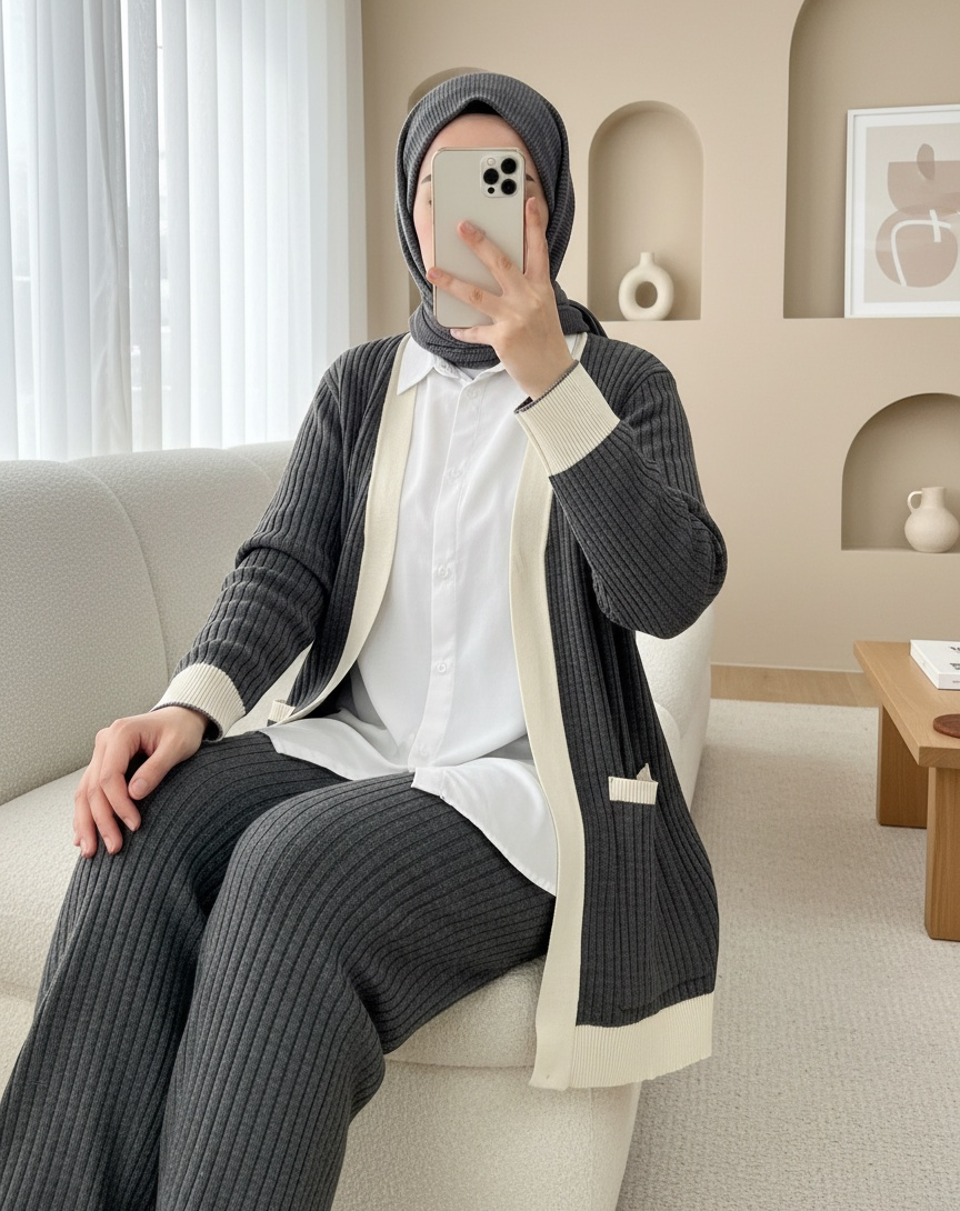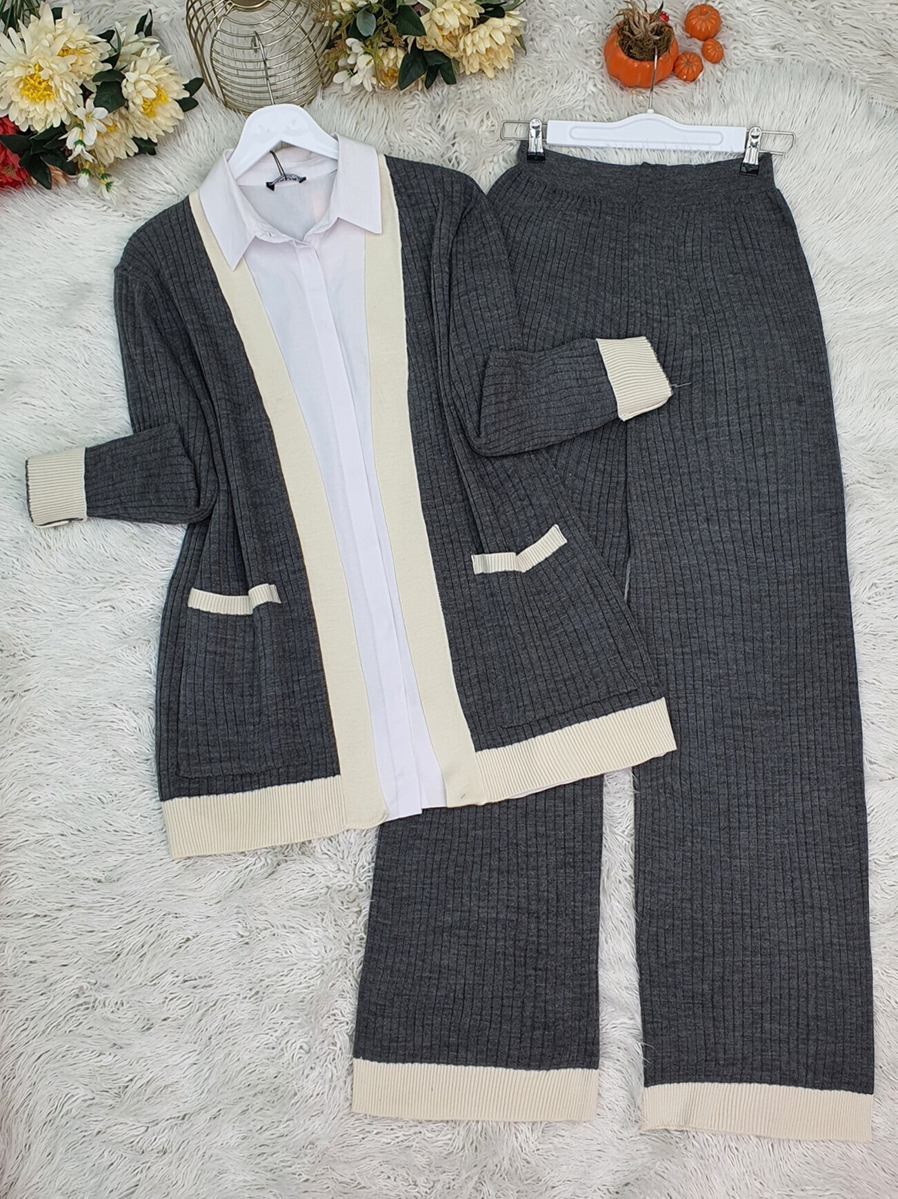 Çift Cepli Fitilli Triko Takım -Füme-Füme