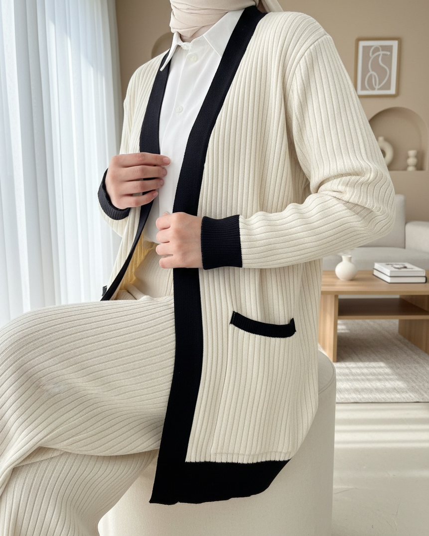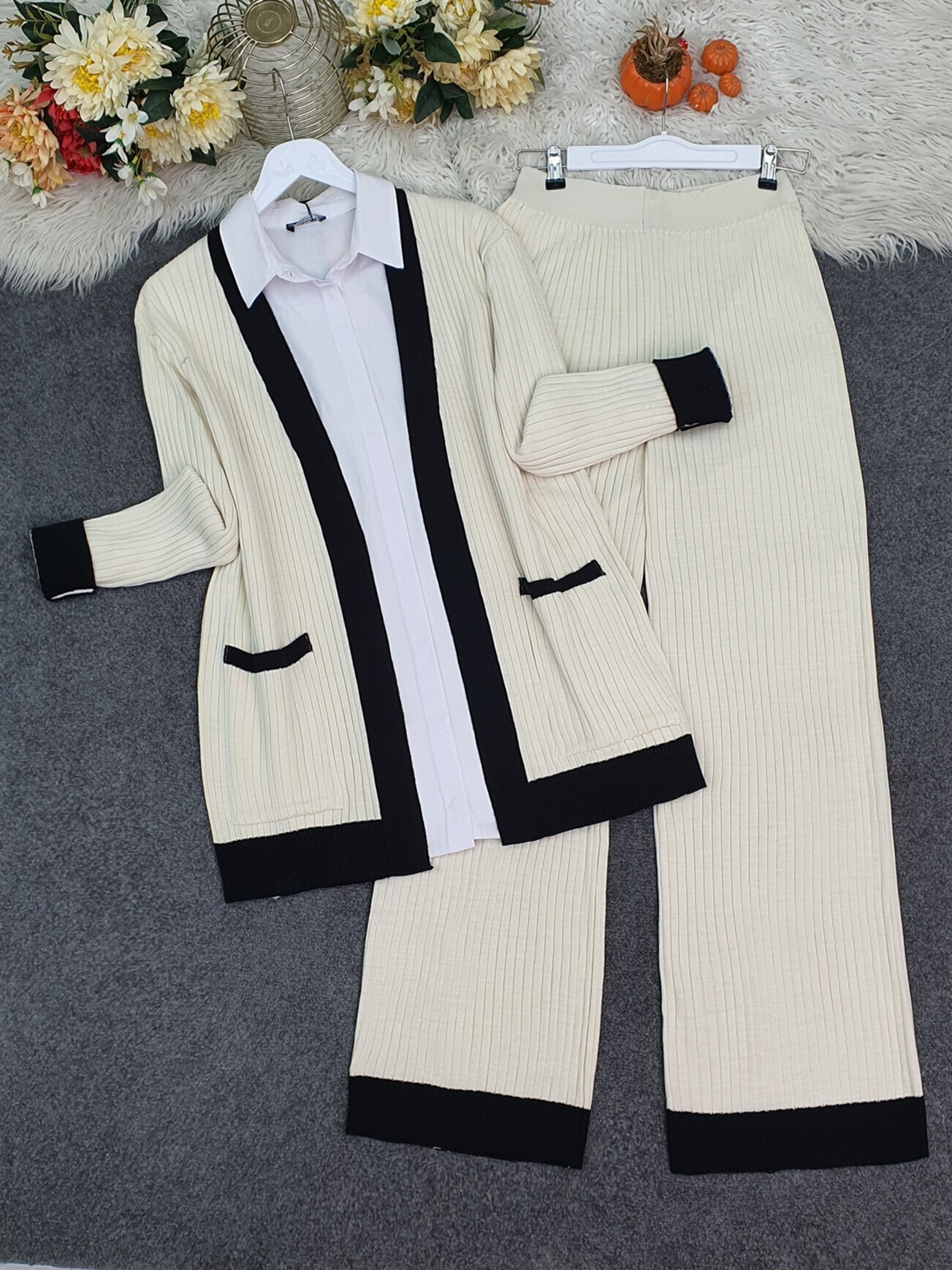 Çift Cepli Fitilli Triko Takım -Krem-Krem