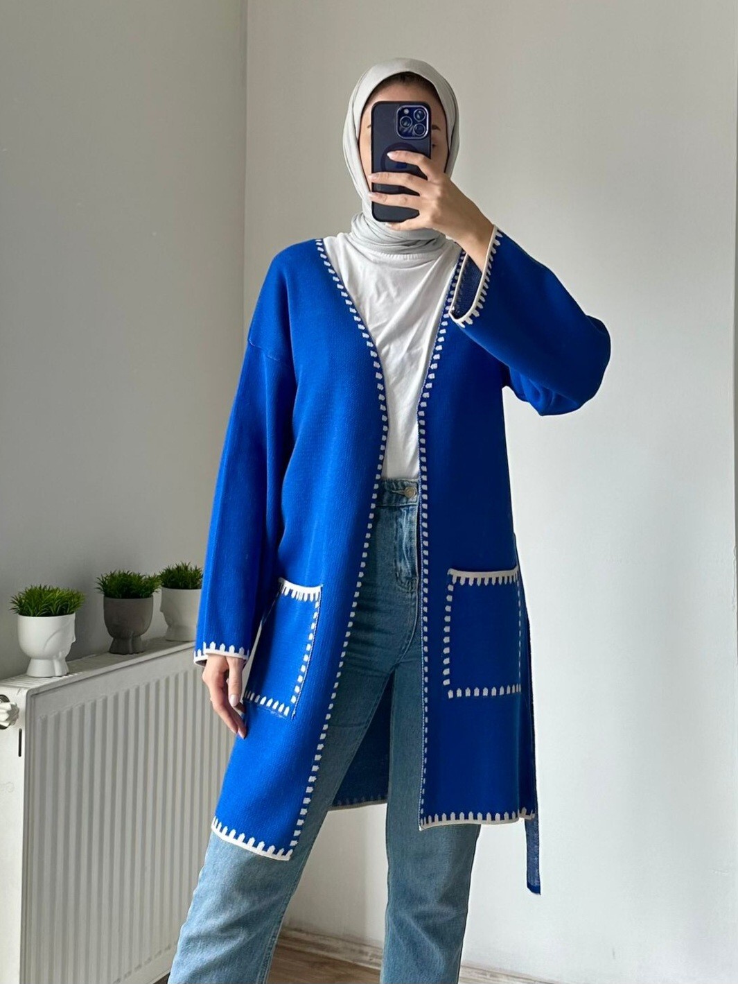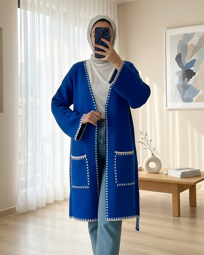 Çift Cepli Kuşaklı Triko Hırka -Saks-Saks