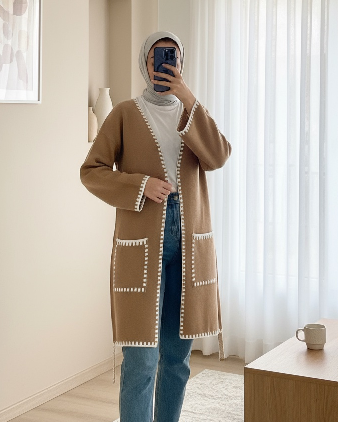 Çift Cepli Kuşaklı Triko Hırka -Tarçın-Tarçın