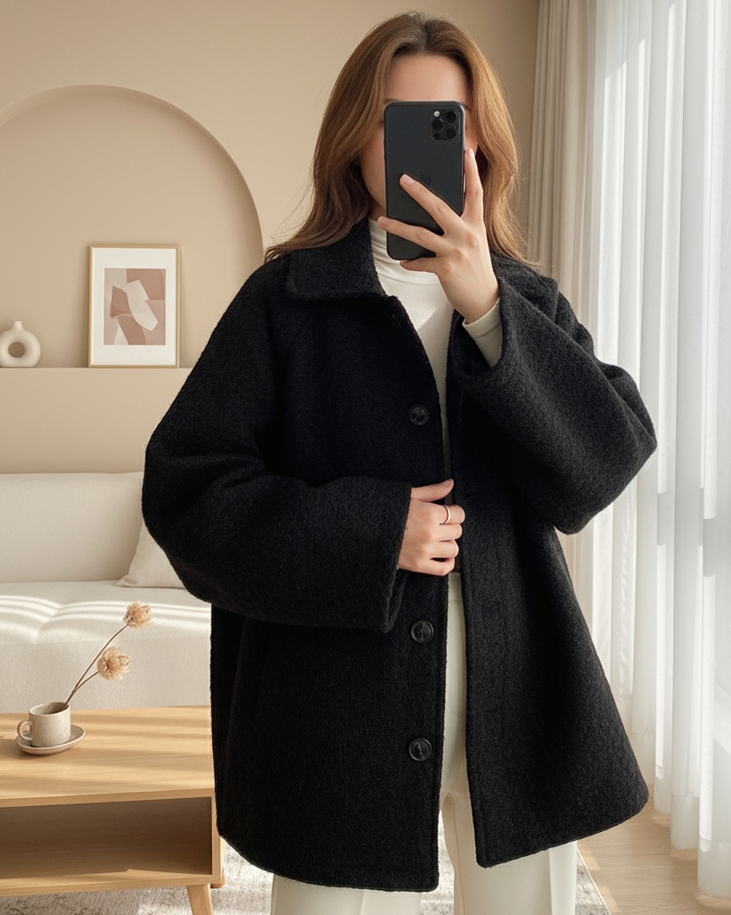 Çift Cepli Önü Düğmeli Astarlı Buklet Kaban -Siyah-Siyah