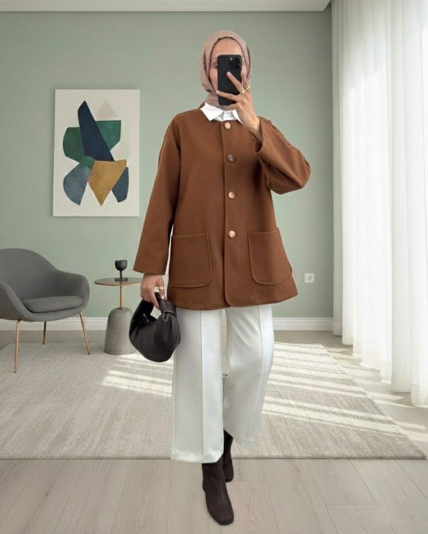 Çift Cepli Önü Düğmeli Kaşe Ceket -Açık Kahve-Açık Kahve