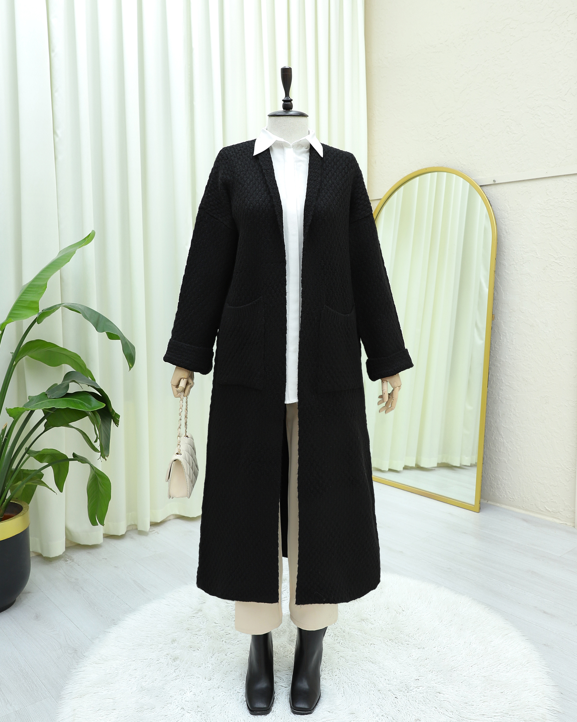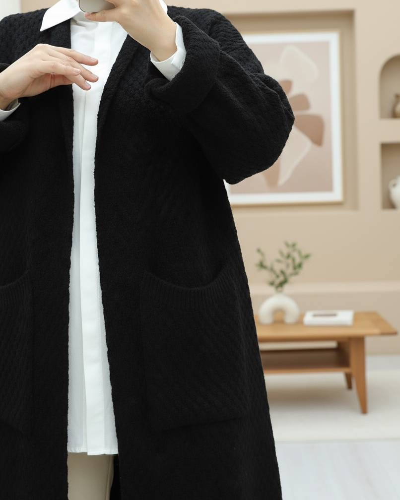 Çift Cepli Uzun Triko Hırka -Siyah-siyah