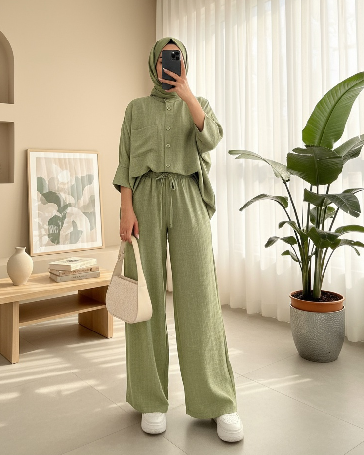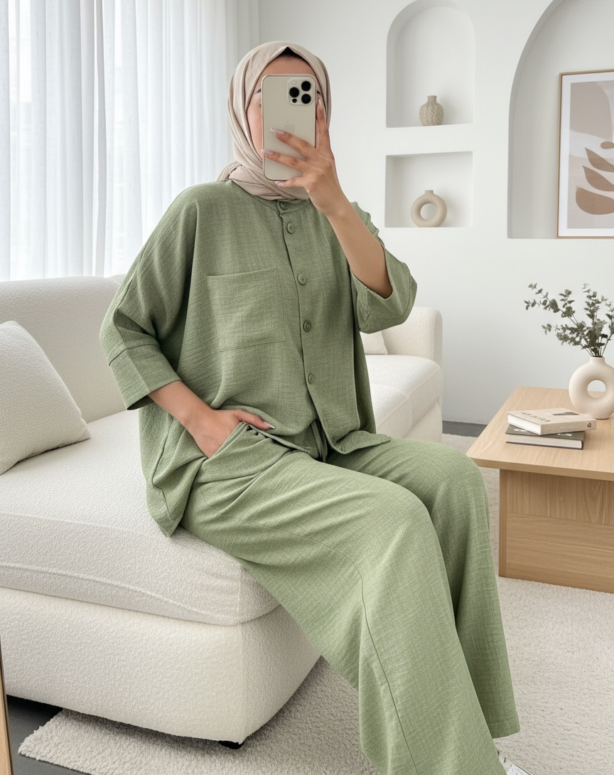Çift Cepli Yarım Yarasa Kol Salaş Gömlek Takım -Haki-Haki