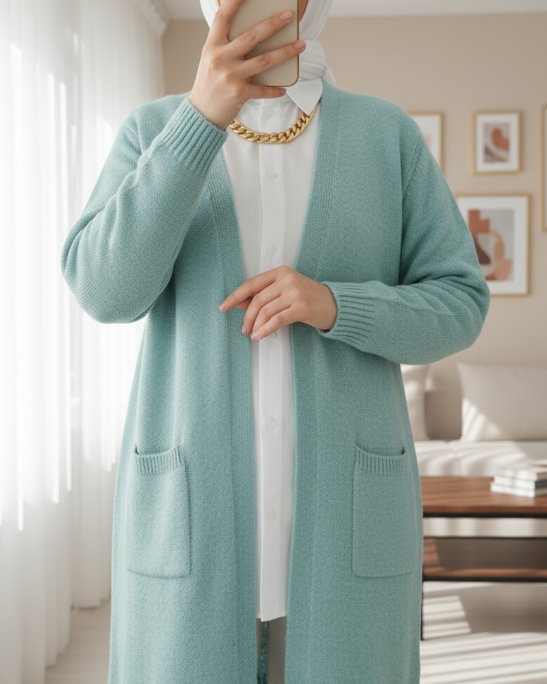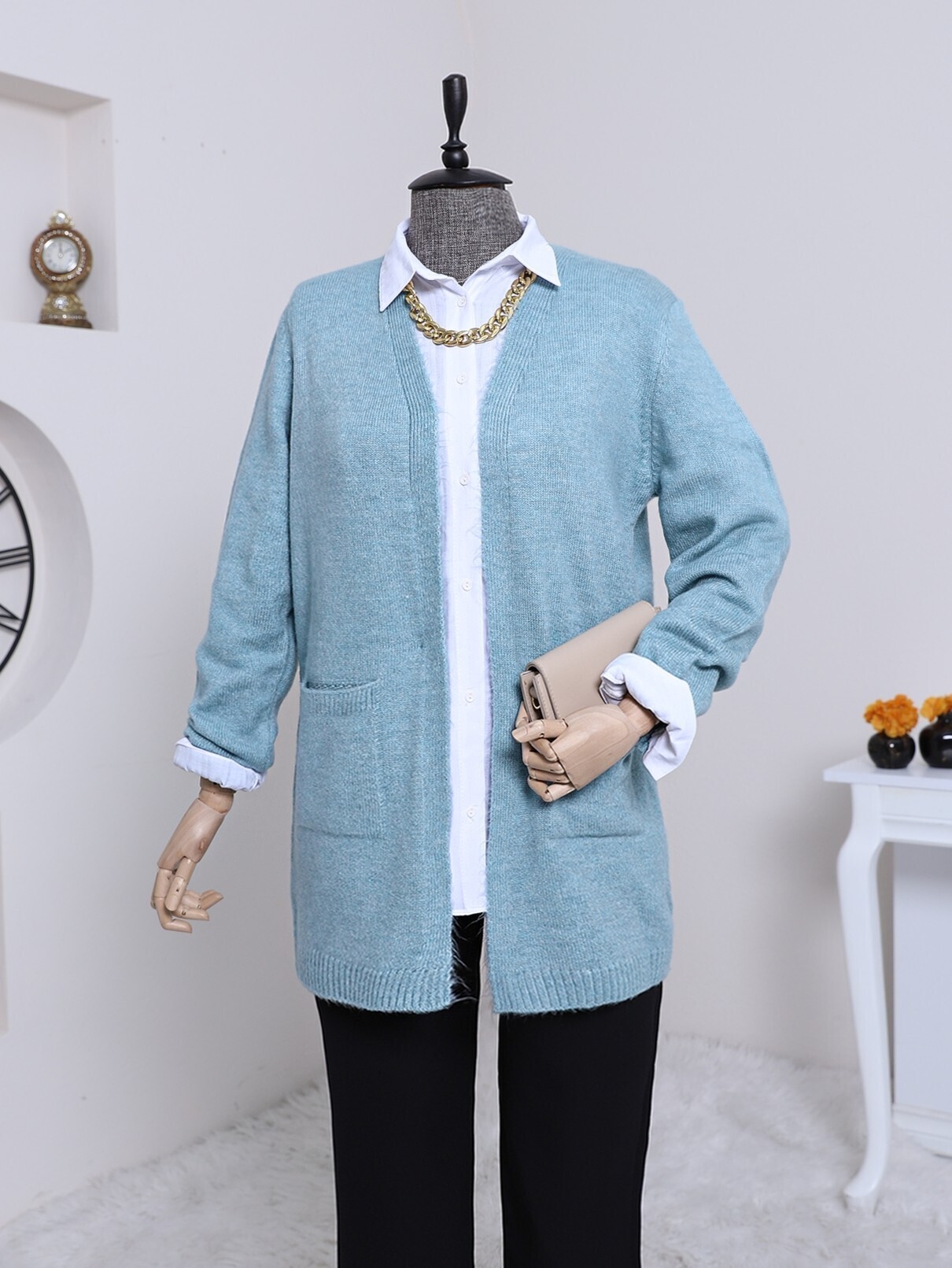 Çift Cepli Yumoş Triko Hırka -Mint-Mint