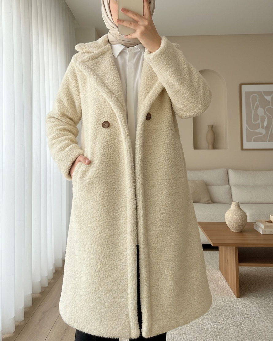 Çift Düğmeli Astarlı Yan Cepli Peluş Kaban -Açık Vizon-Açık Vizon