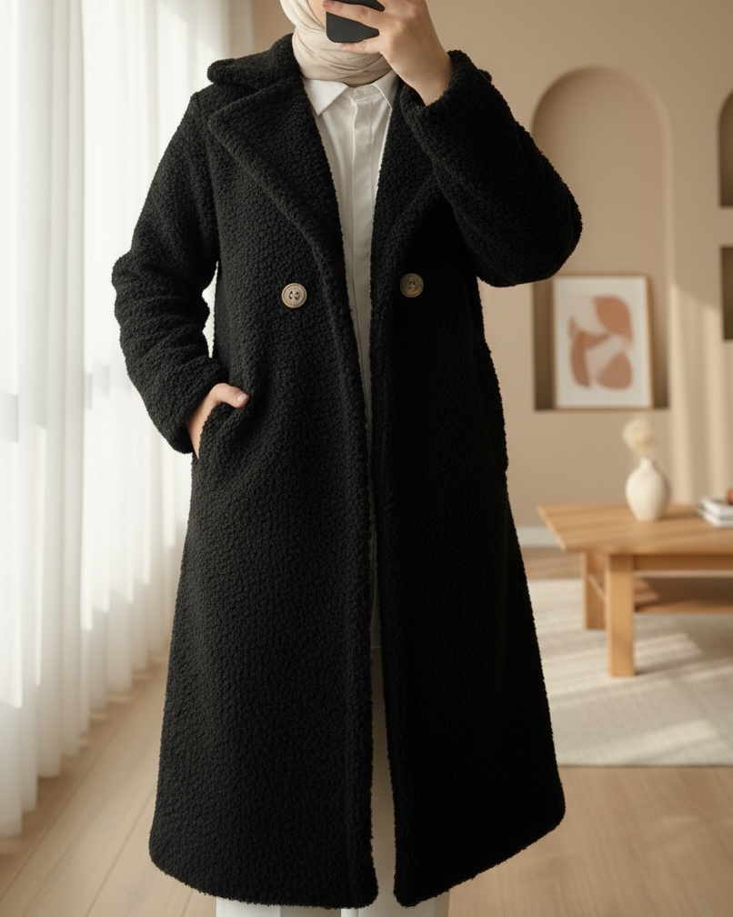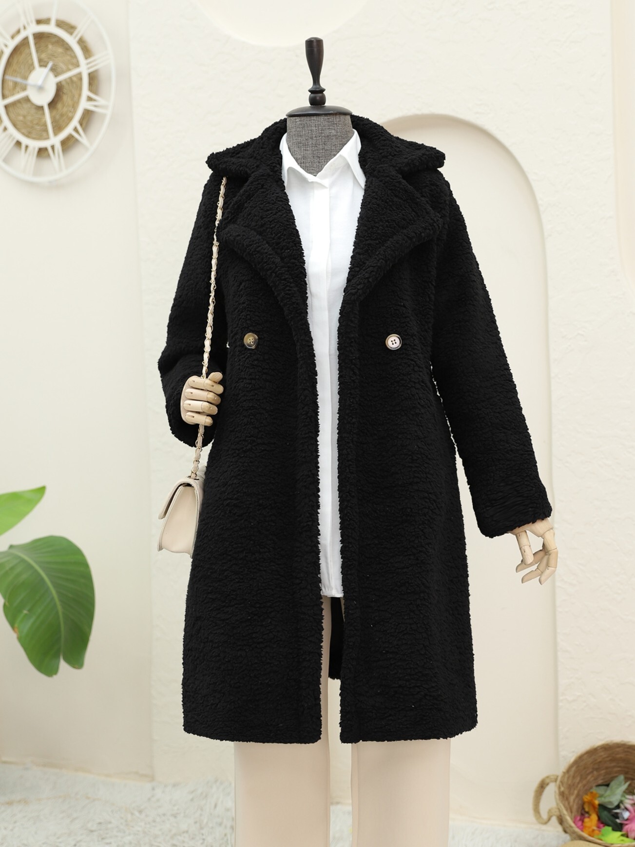 Çift Düğmeli Astarlı Yan Cepli Peluş Kaban -Siyah-Siyah