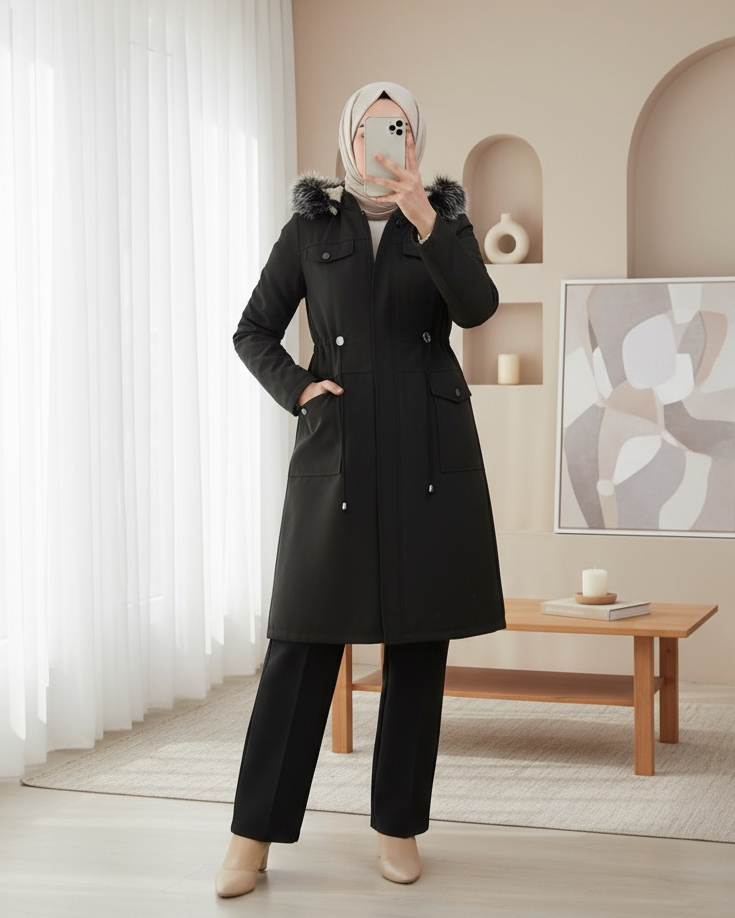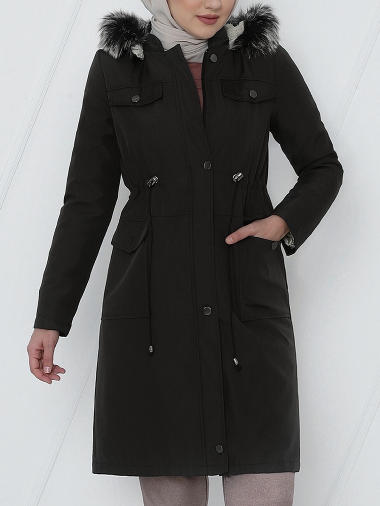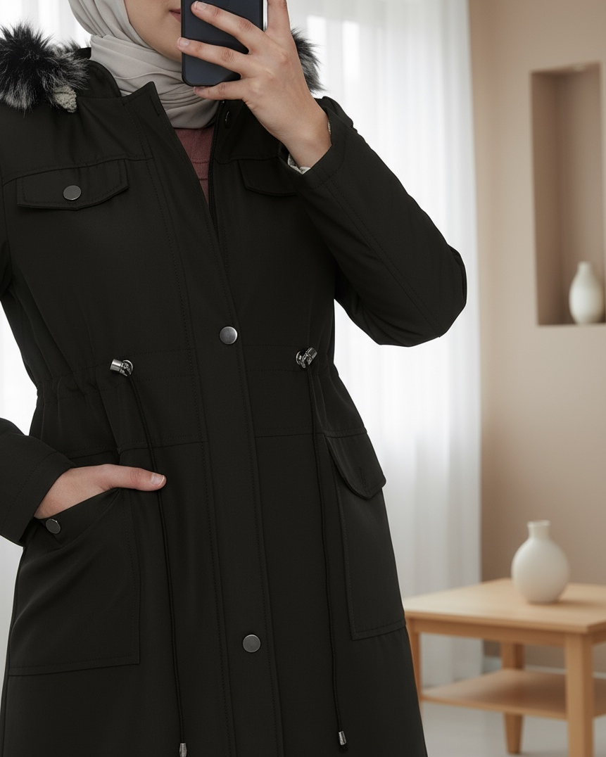 Çıkma Kapşonlu Bağcıklı Bondit Kısa Kaban -Siyah-Siyah