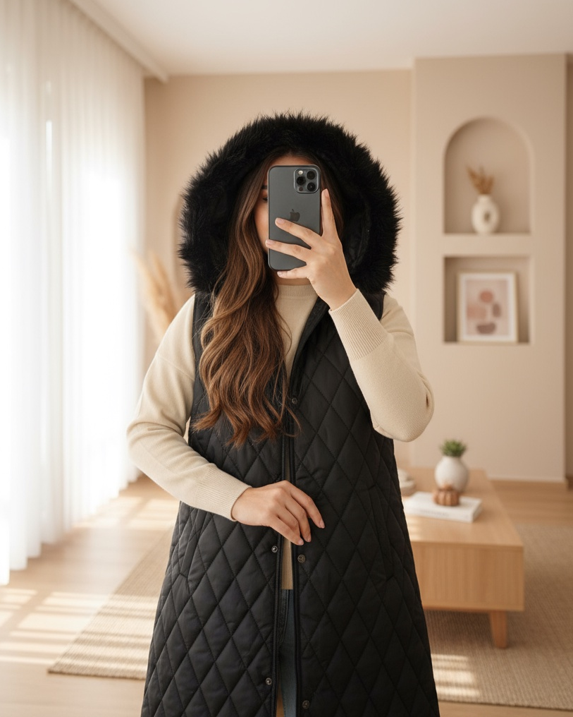 Çıkma Kapşonlu Kapitone Uzun Yelek -Siyah-Siyah