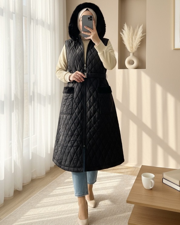 Çıkma Kapşonlu Kemerli Kapitone Yelek -Siyah-Siyah
