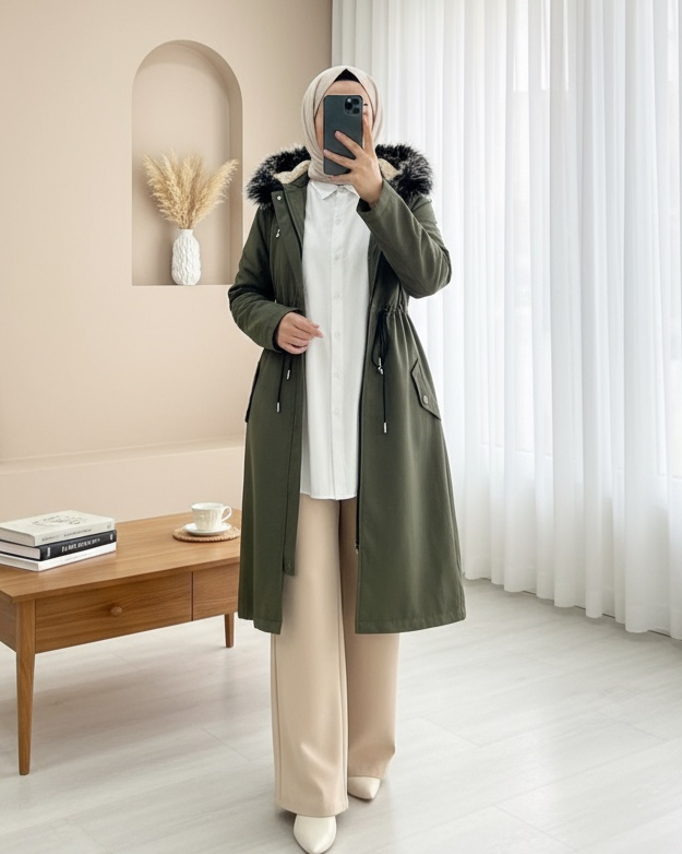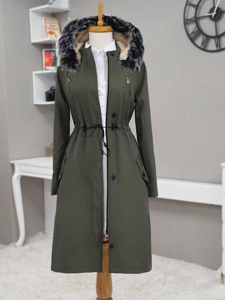 Çıkma Kapşonlu Tünel Bağcıklı Kısa Kaban -Haki-Haki