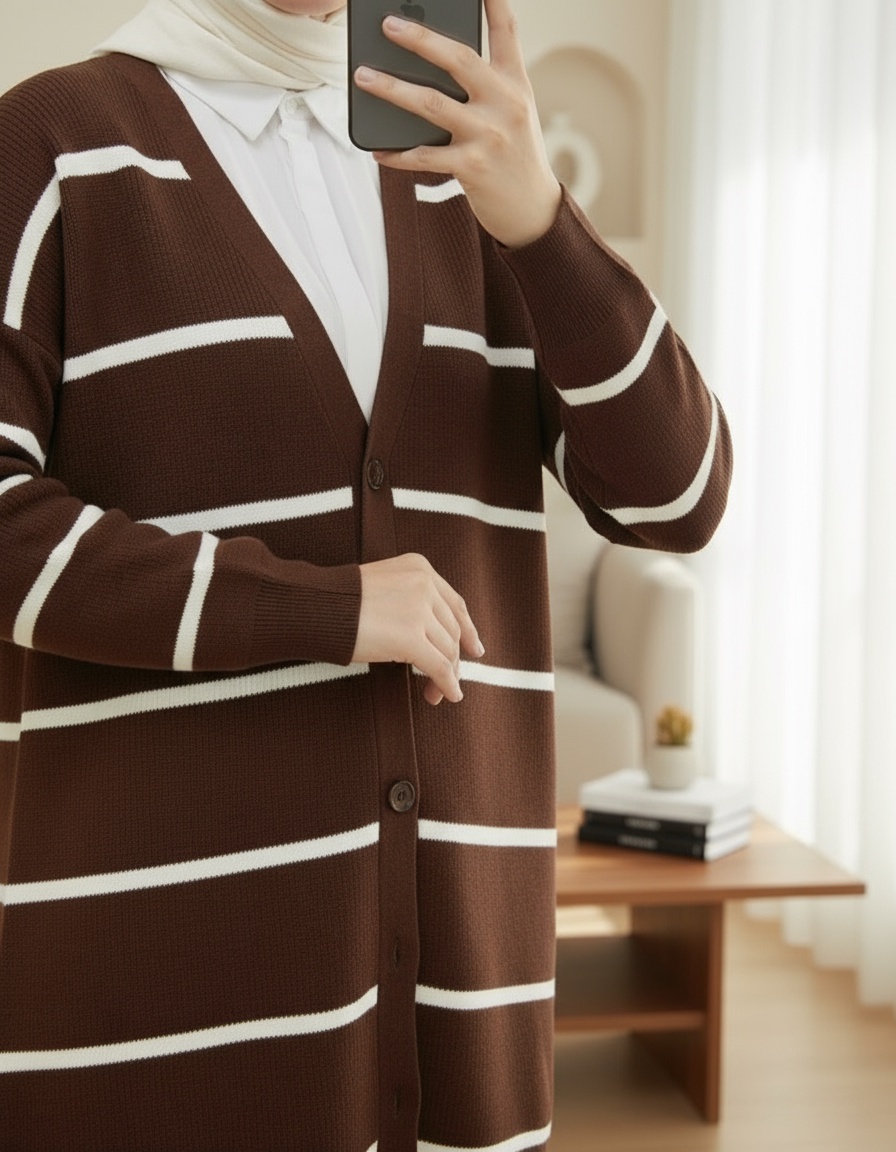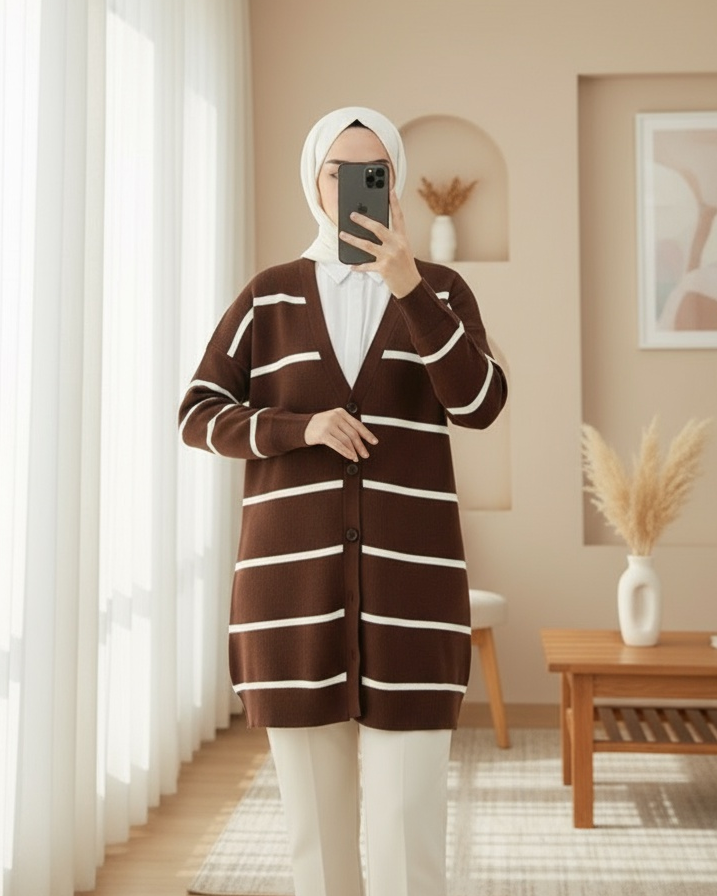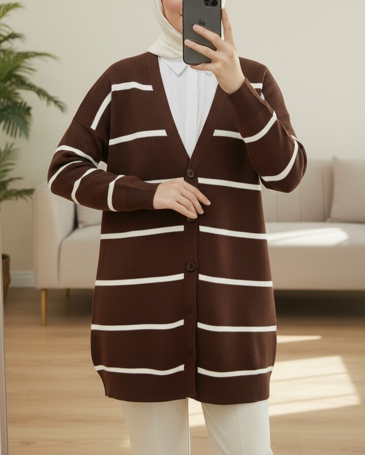 Çizgili Düğmeli Hırka -Kahve-Kahve