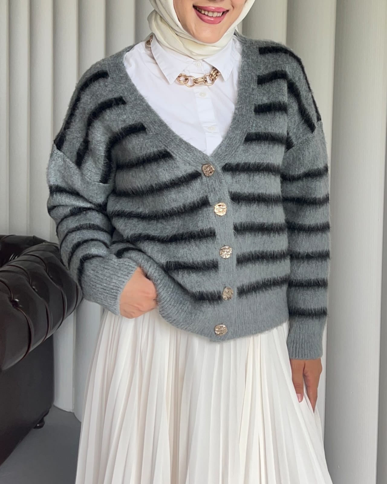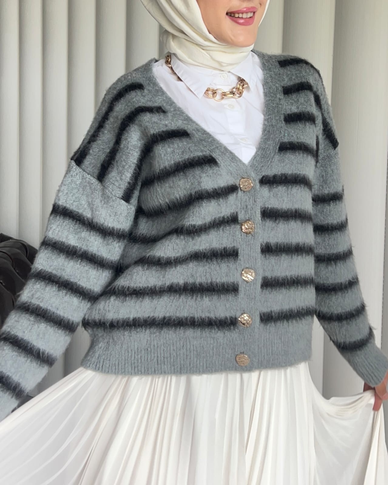 Çizgili Düğmeli Sakallı Triko Hırka -Gri-Gri