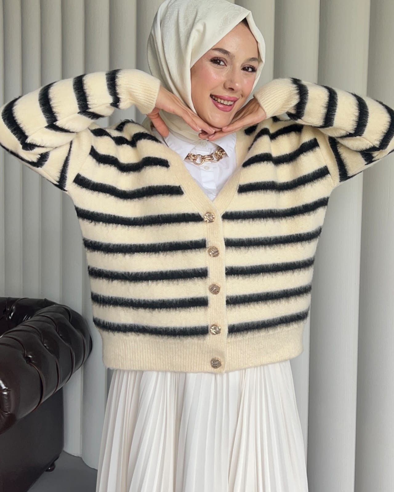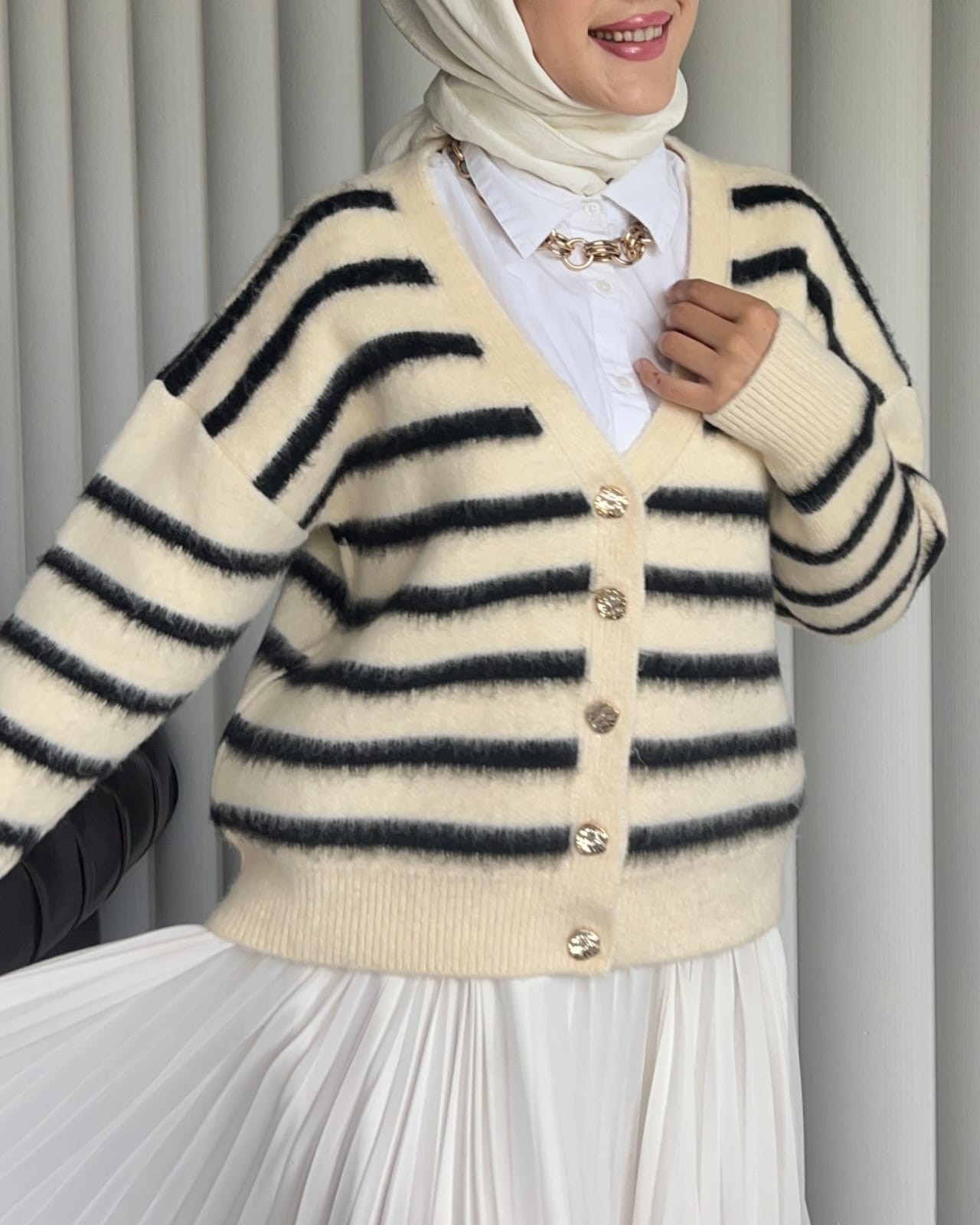 Çizgili Düğmeli Sakallı Triko Hırka -Krem-Krem