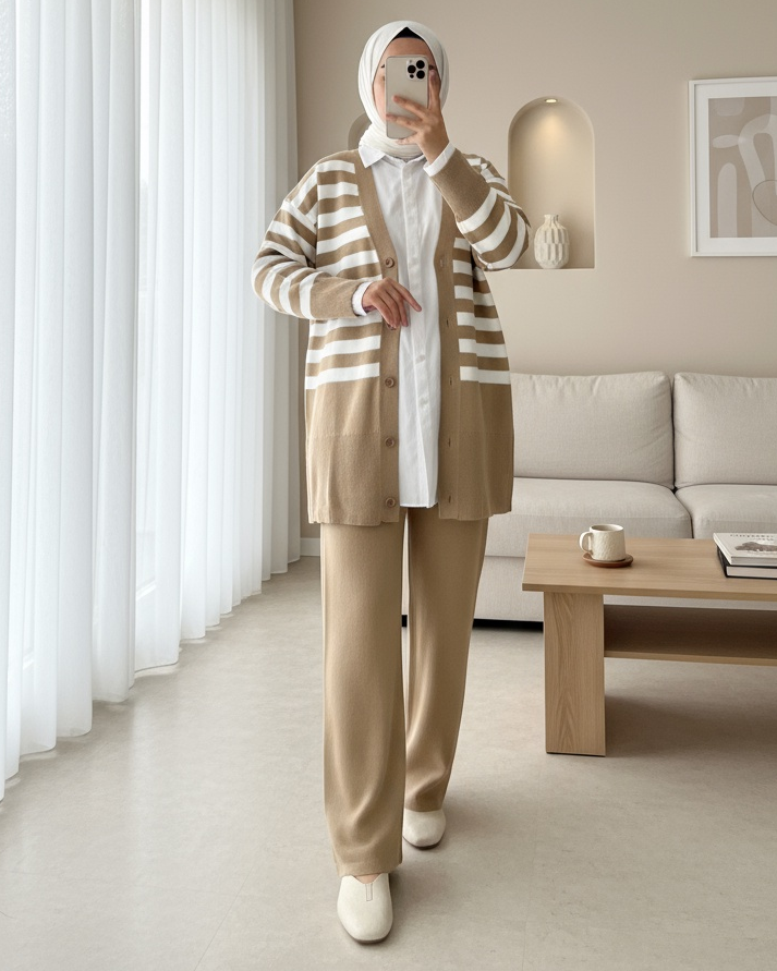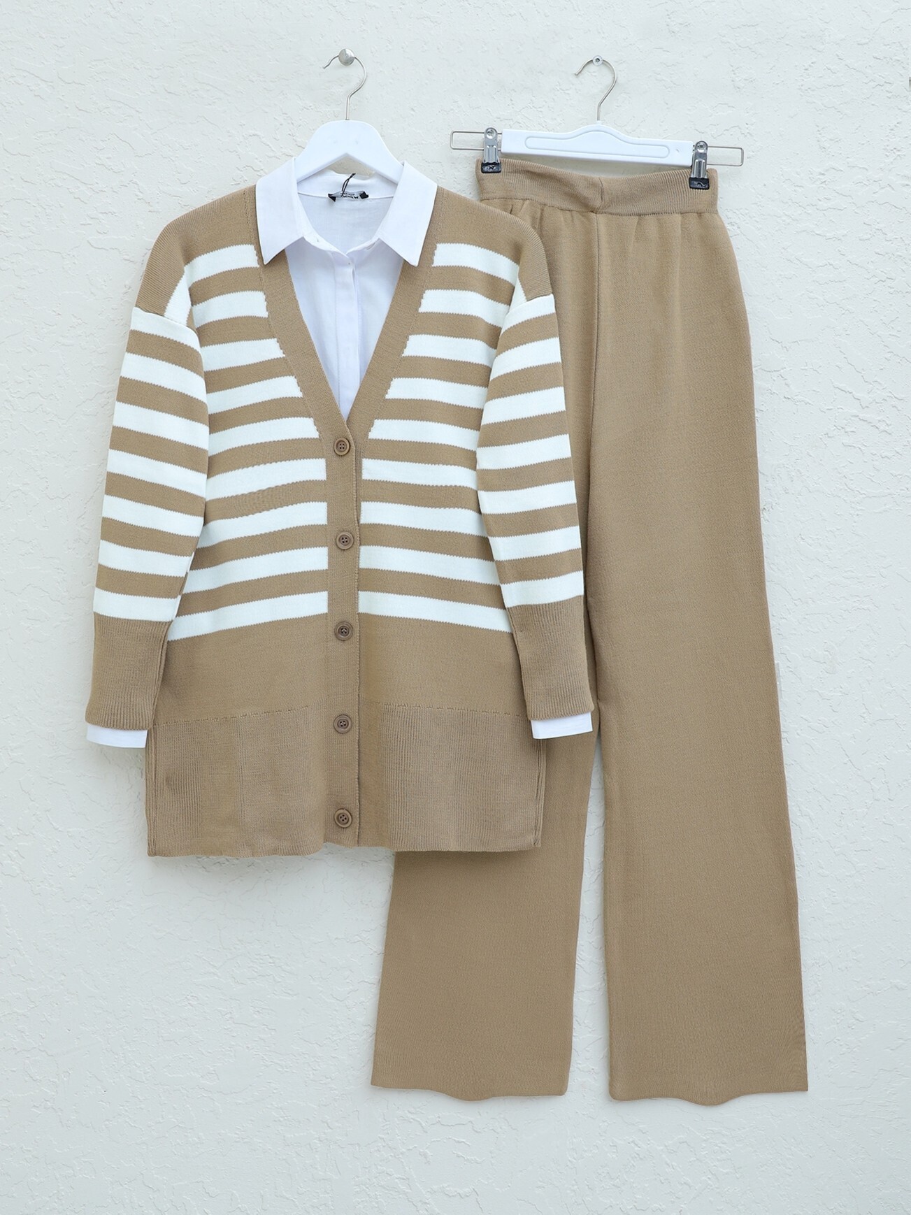 Çizgili Düğmeli Triko Takım -Taba-Taba