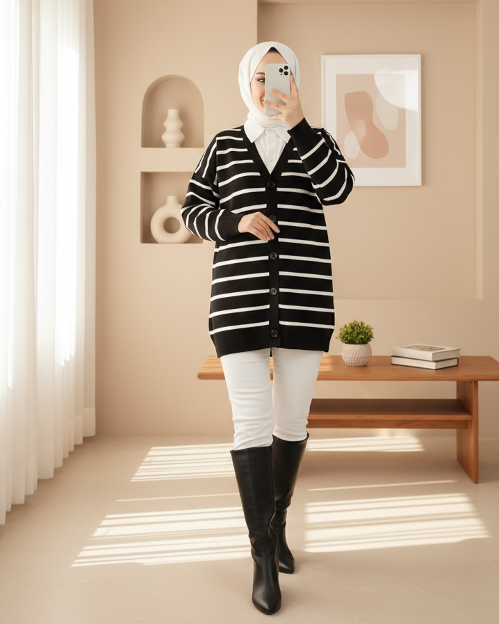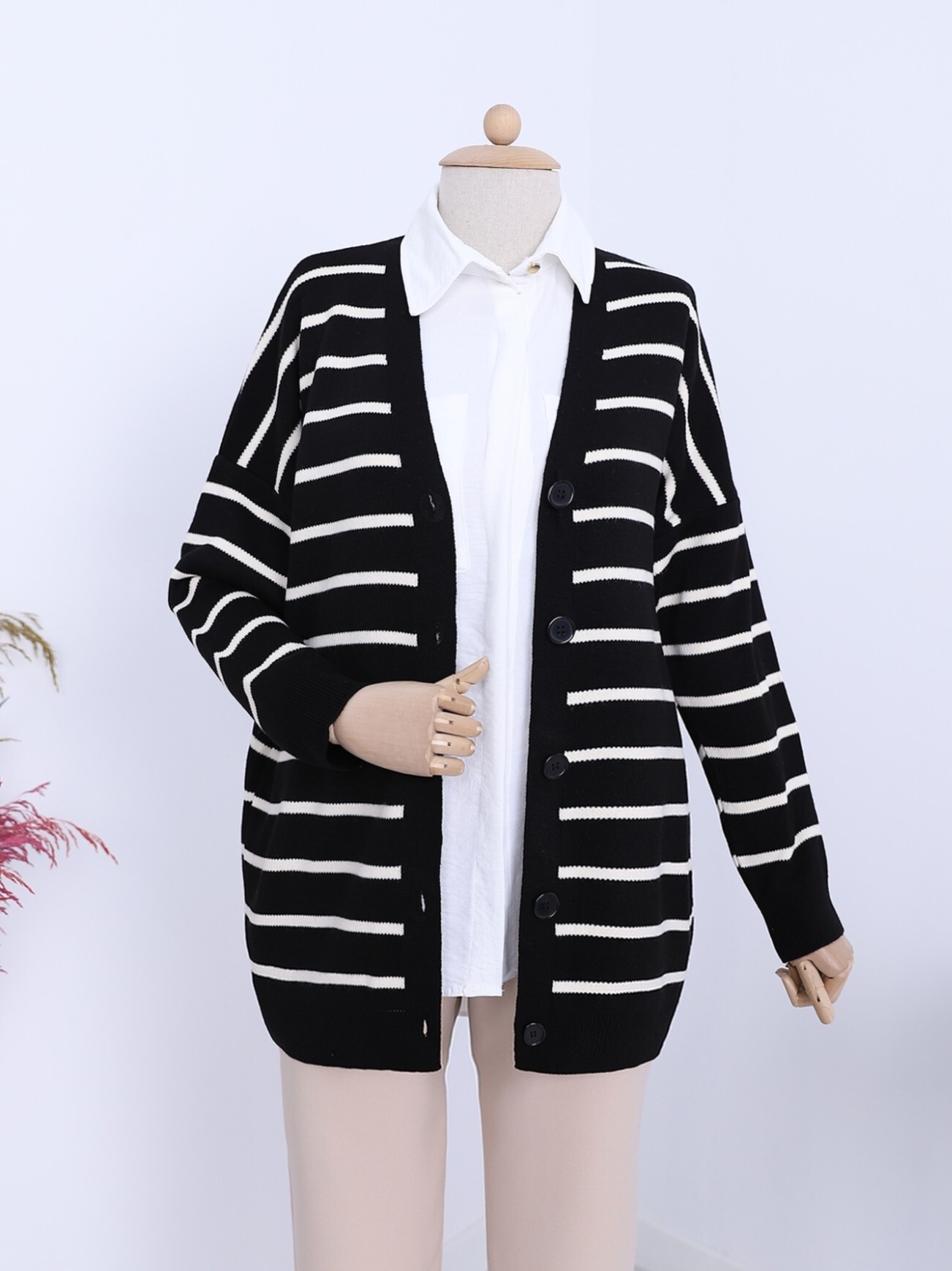 Çizgili Düğmeli V Yaka Triko Hırka -Siyah-Siyah