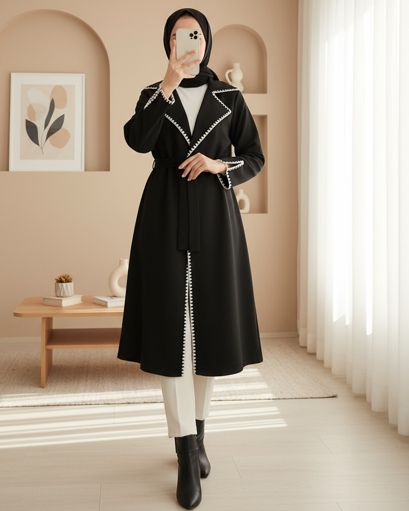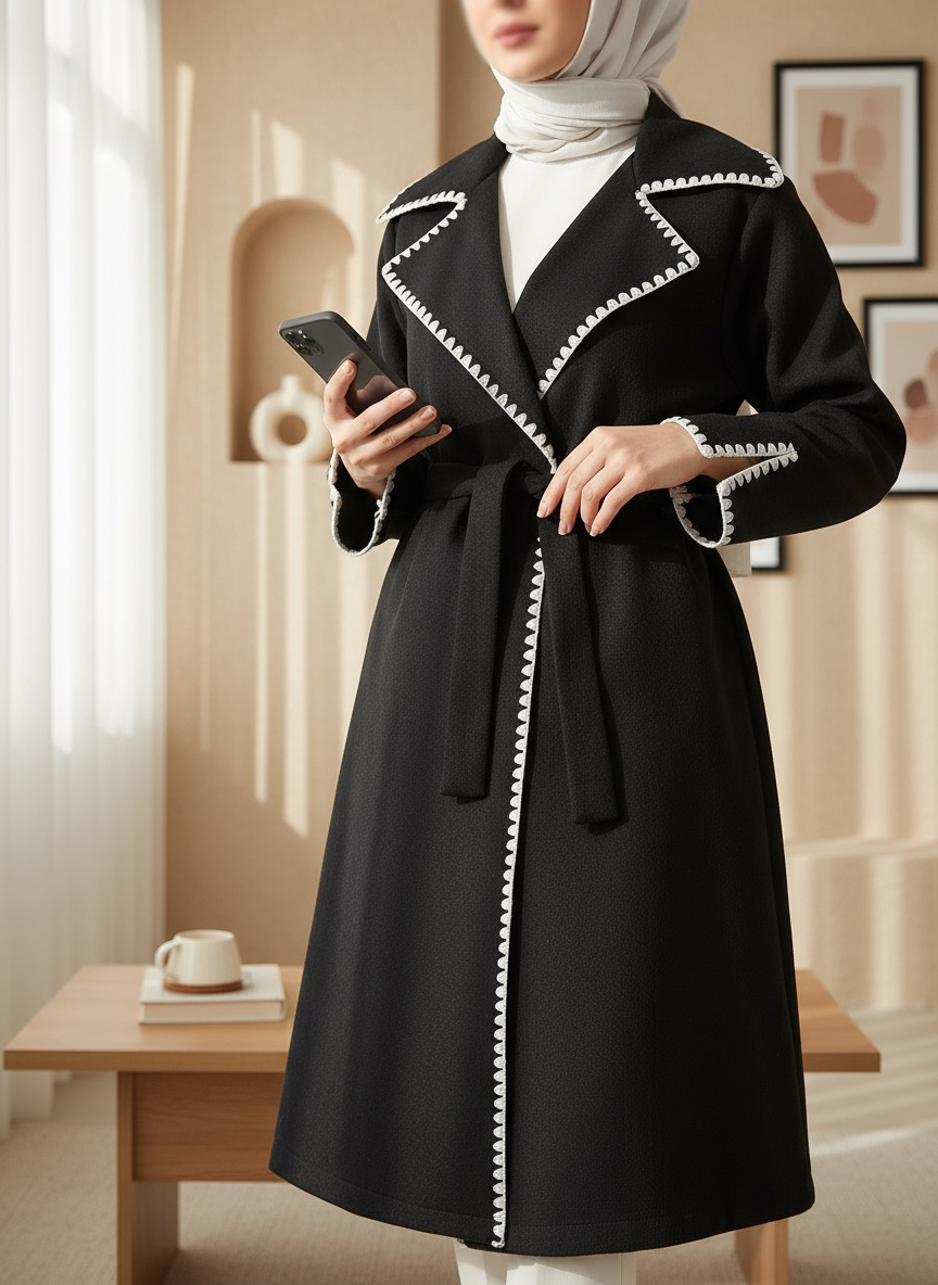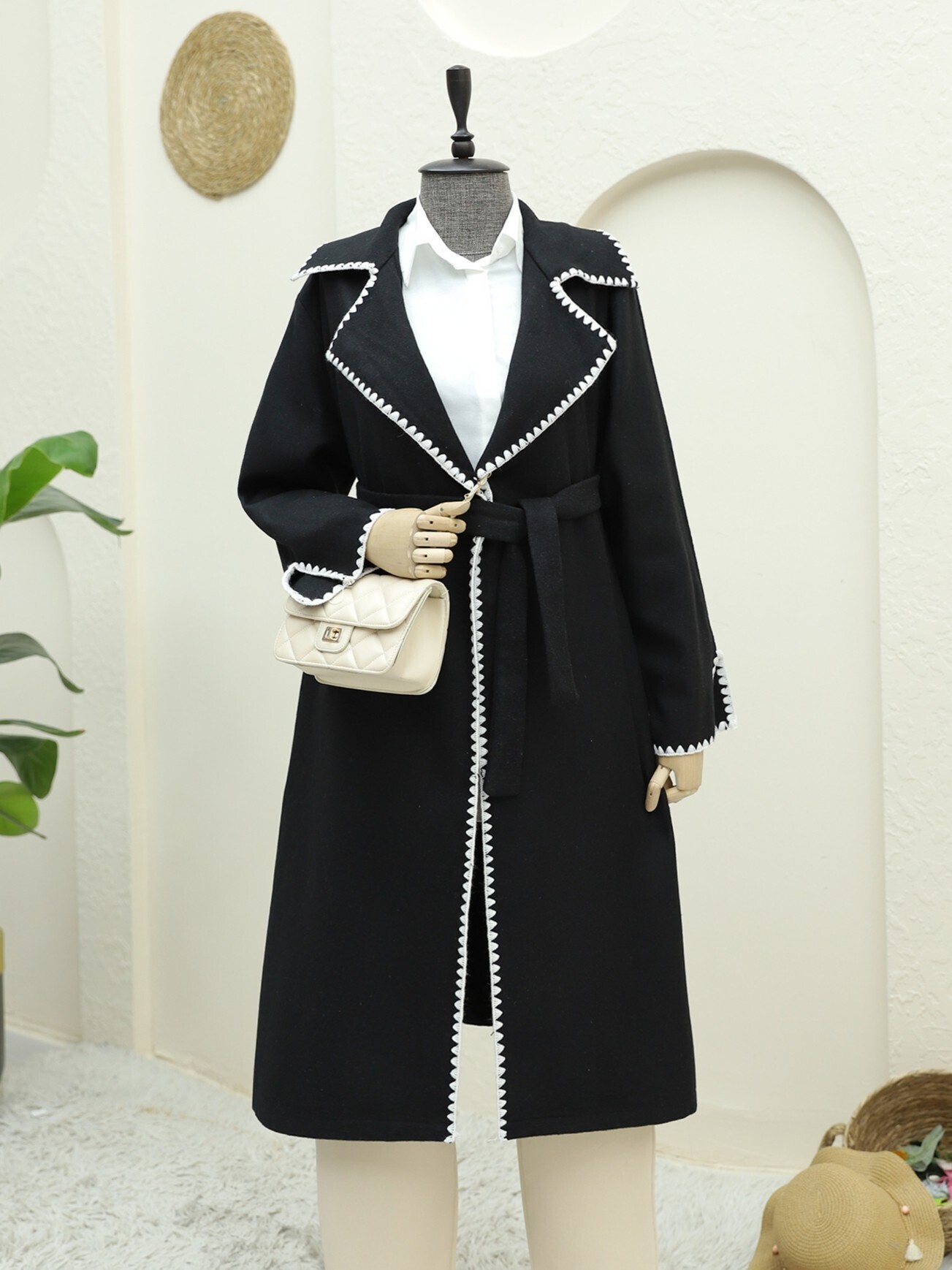 Çoban Dikiş Belden Bağlamalı Kaşe Kaban -Siyah-Siyah