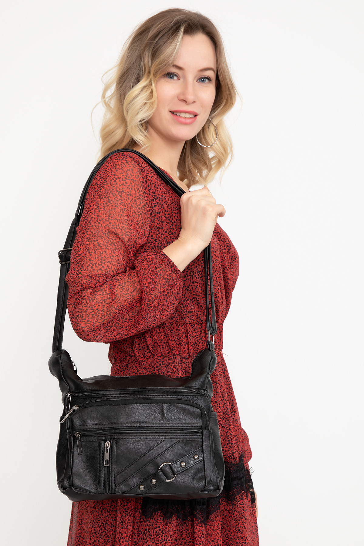 Çok Bölmeli Deri Bayan Çapraz Çanta-Siyah