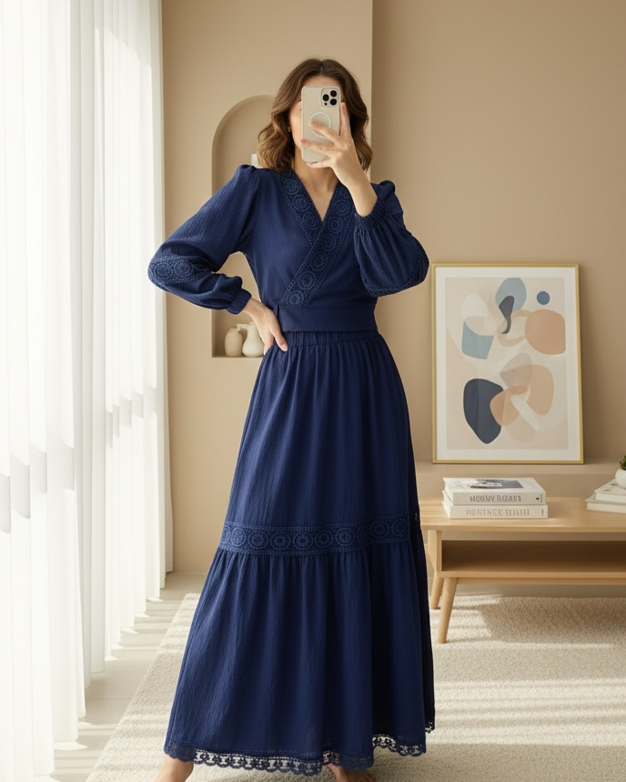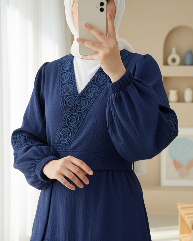 Dantel Detaylı Bağlamalı Kolu Lastikli Kraş Etekli Takım -Laci-Lacivert