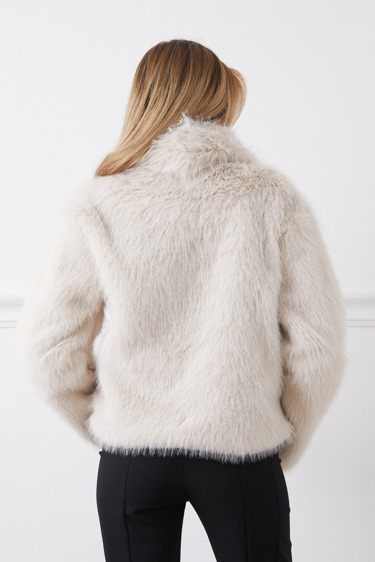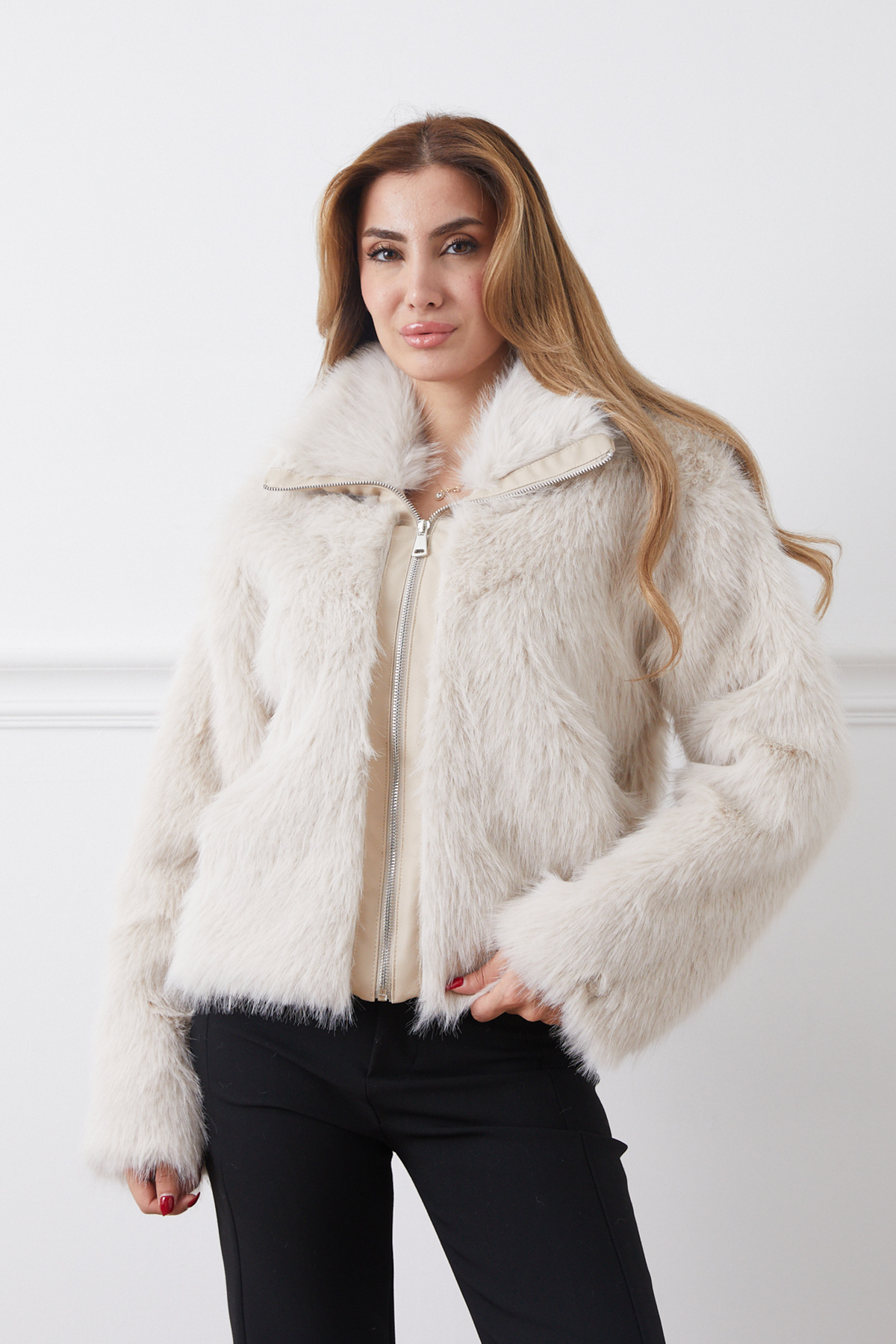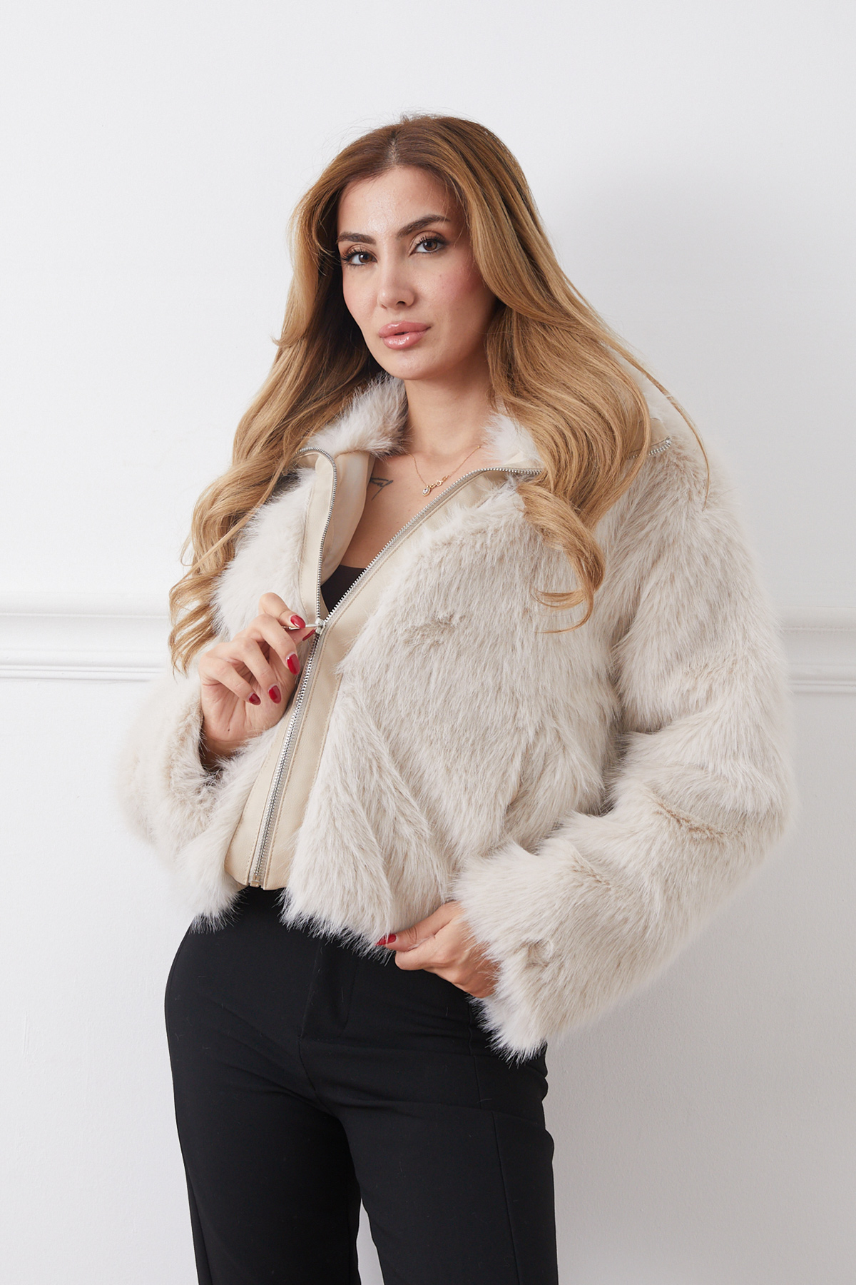 Deri Detaylı Fermuarlı Kürk Mont-Bej