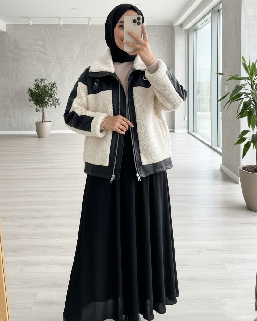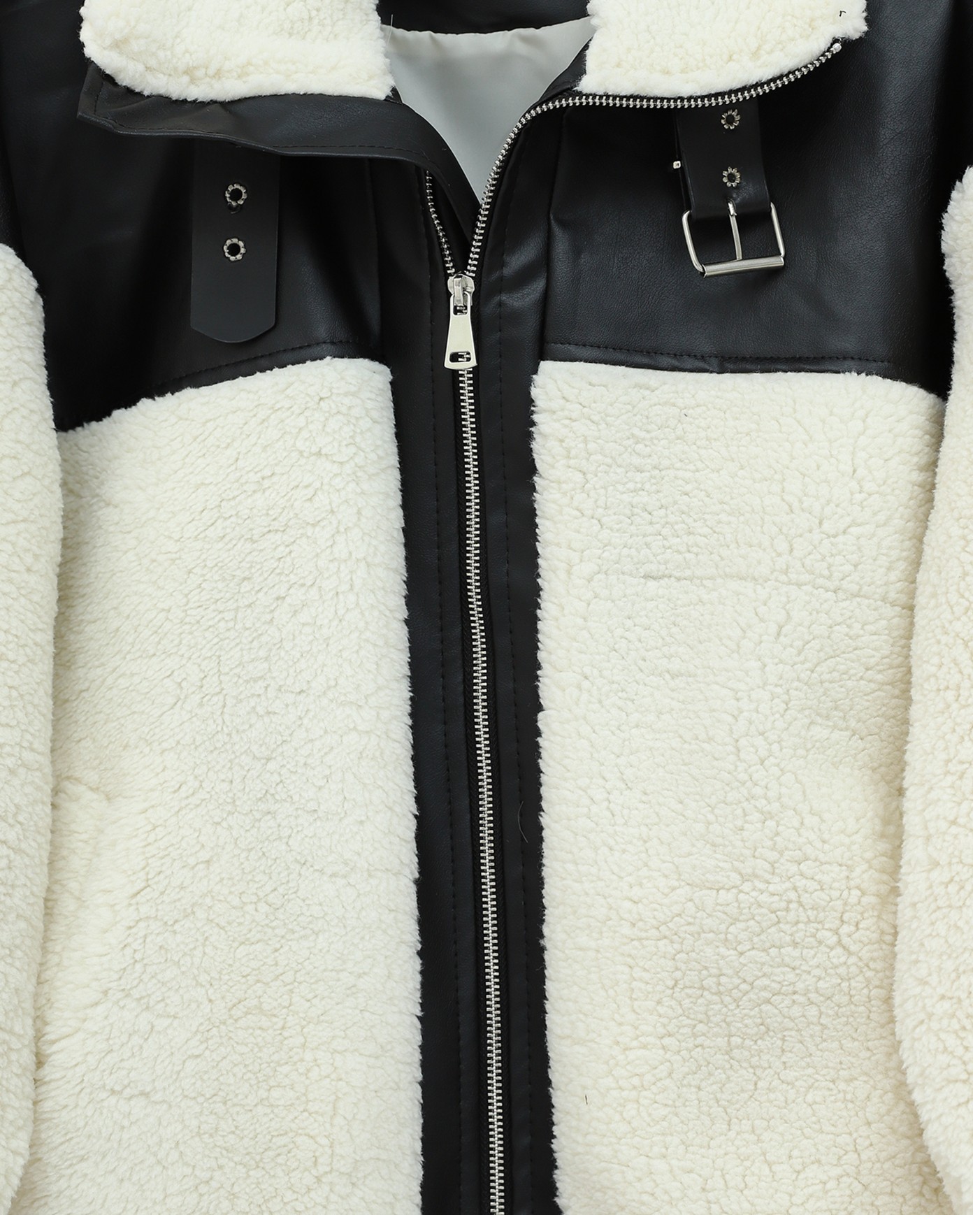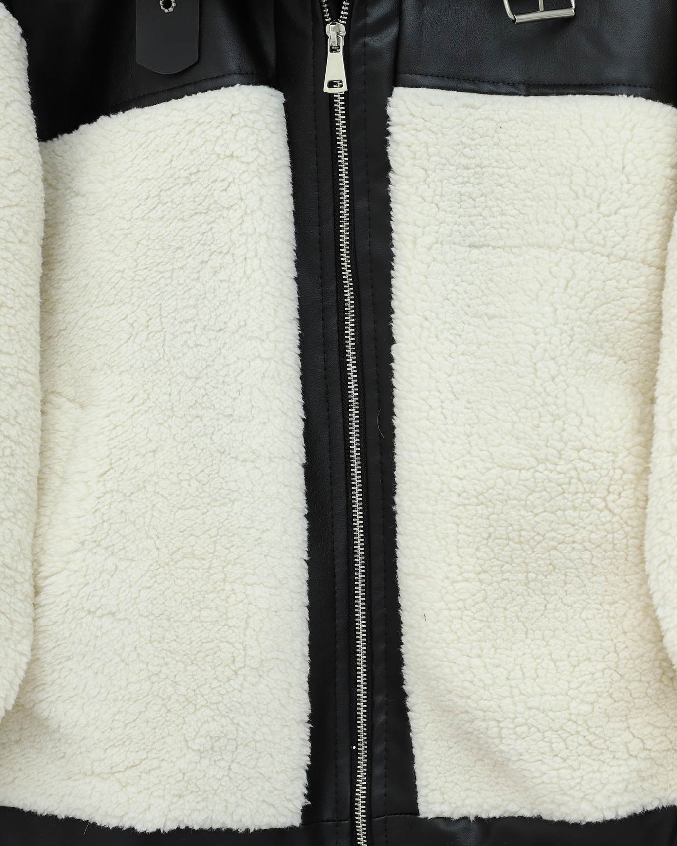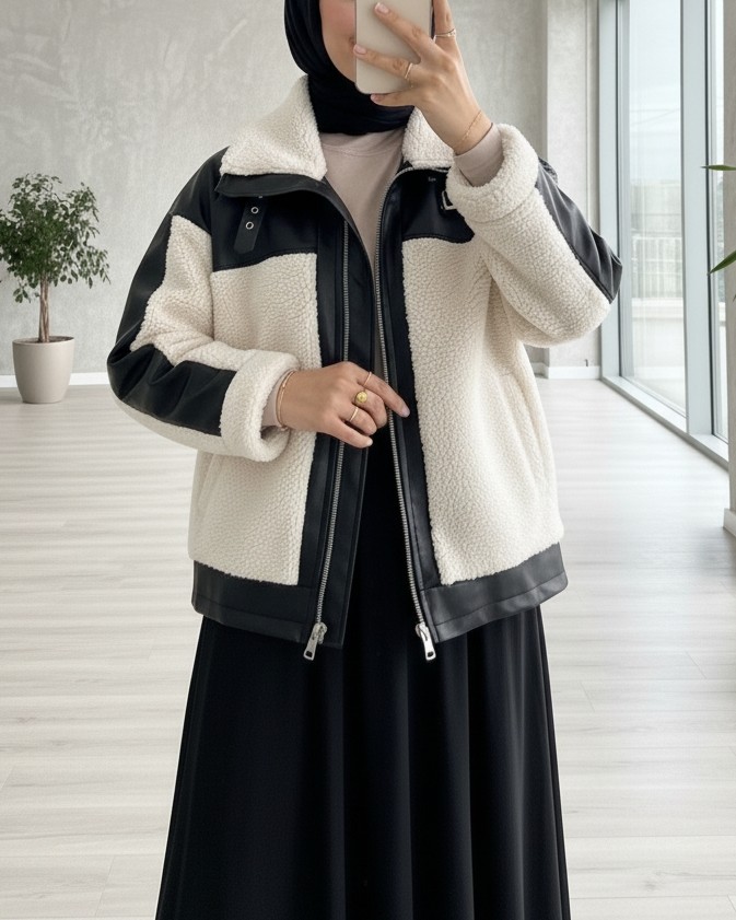 Deri Garni Detaylı Fermuarlı Cepli Peluş Mont -Krem-Krem
