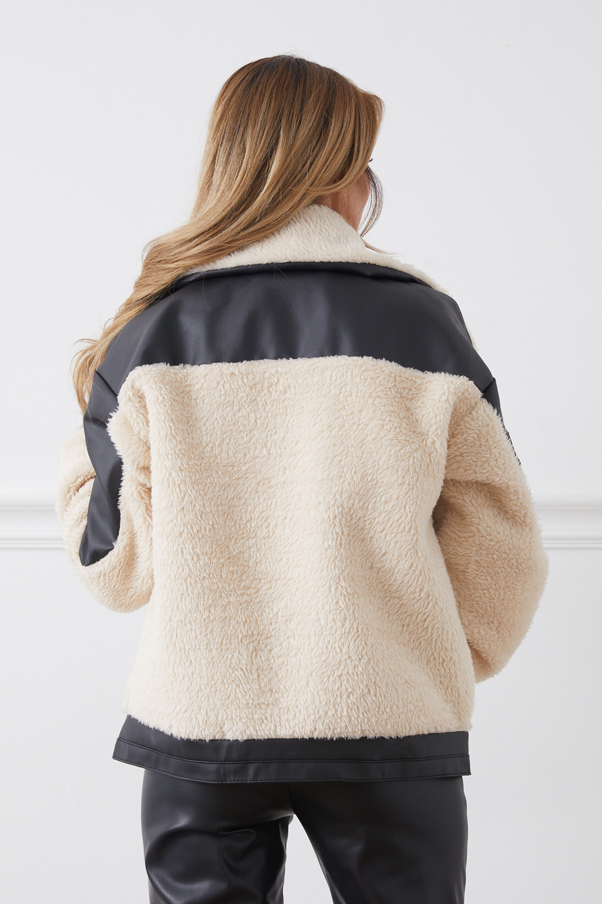 Deri Garnili Fermuarlı Peluş Mont-Bej
