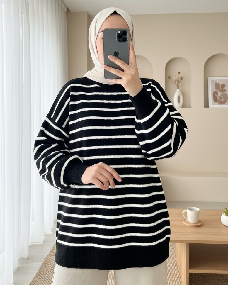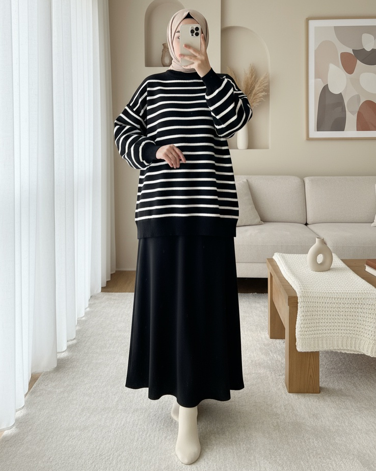 Dik Yaka Balon Kol Triko Tunik -Siyah-Siyah