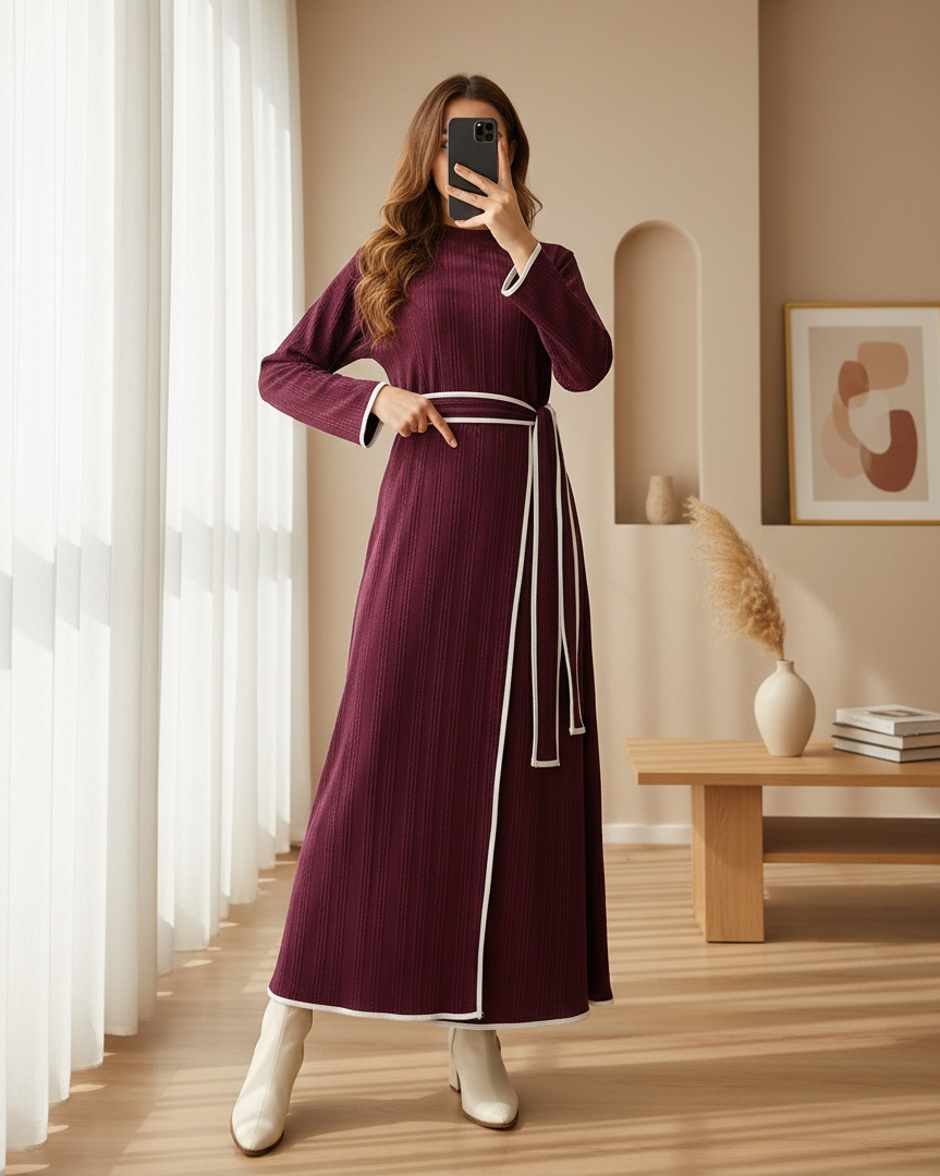 Dik Yaka Örme Krep Beli Bağlamalı İki Parçalı Elbise -Mor-Mor