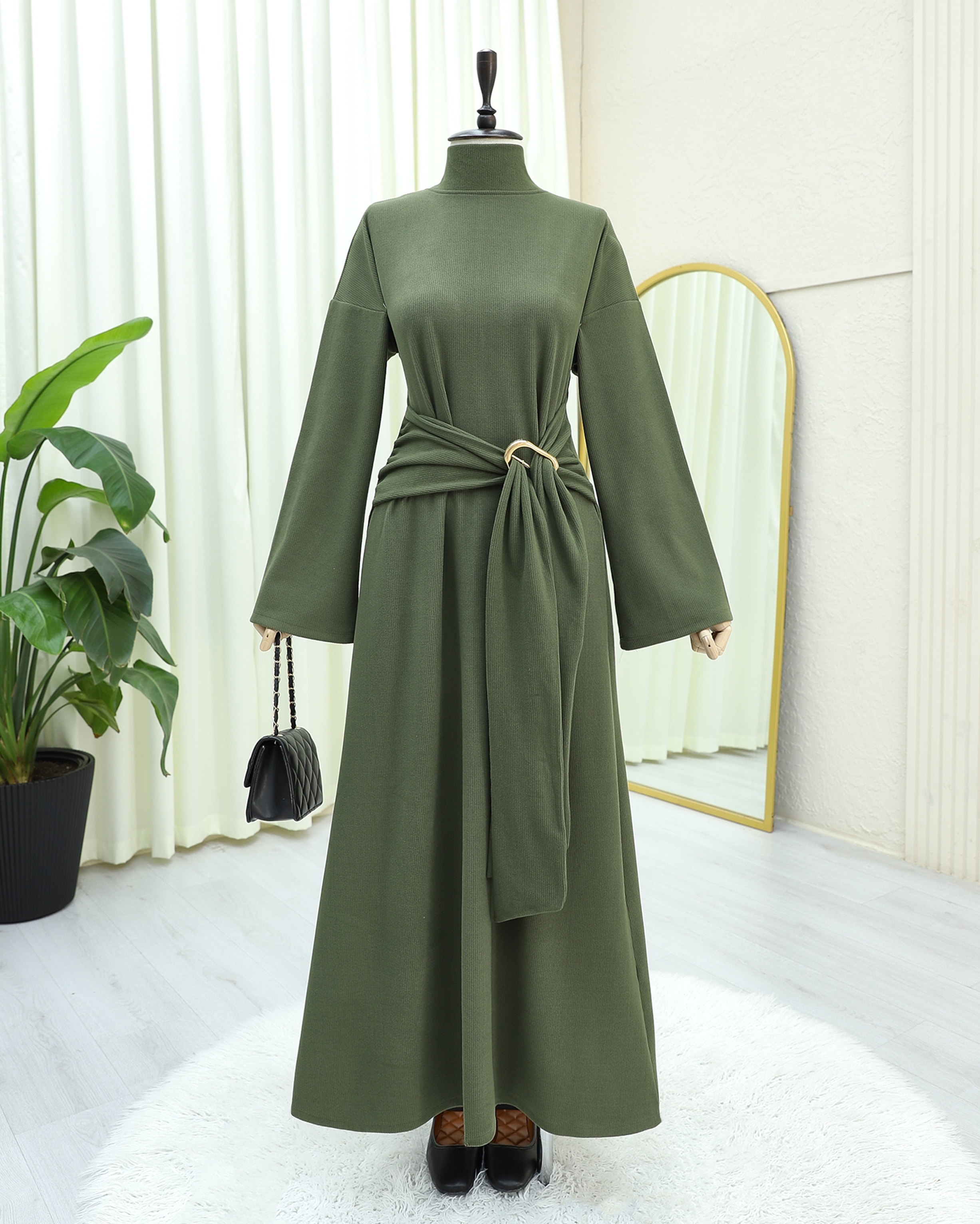 Dik Yaka Tokalı Bağcıklı Uzun Selanik Elbise -Haki-Haki