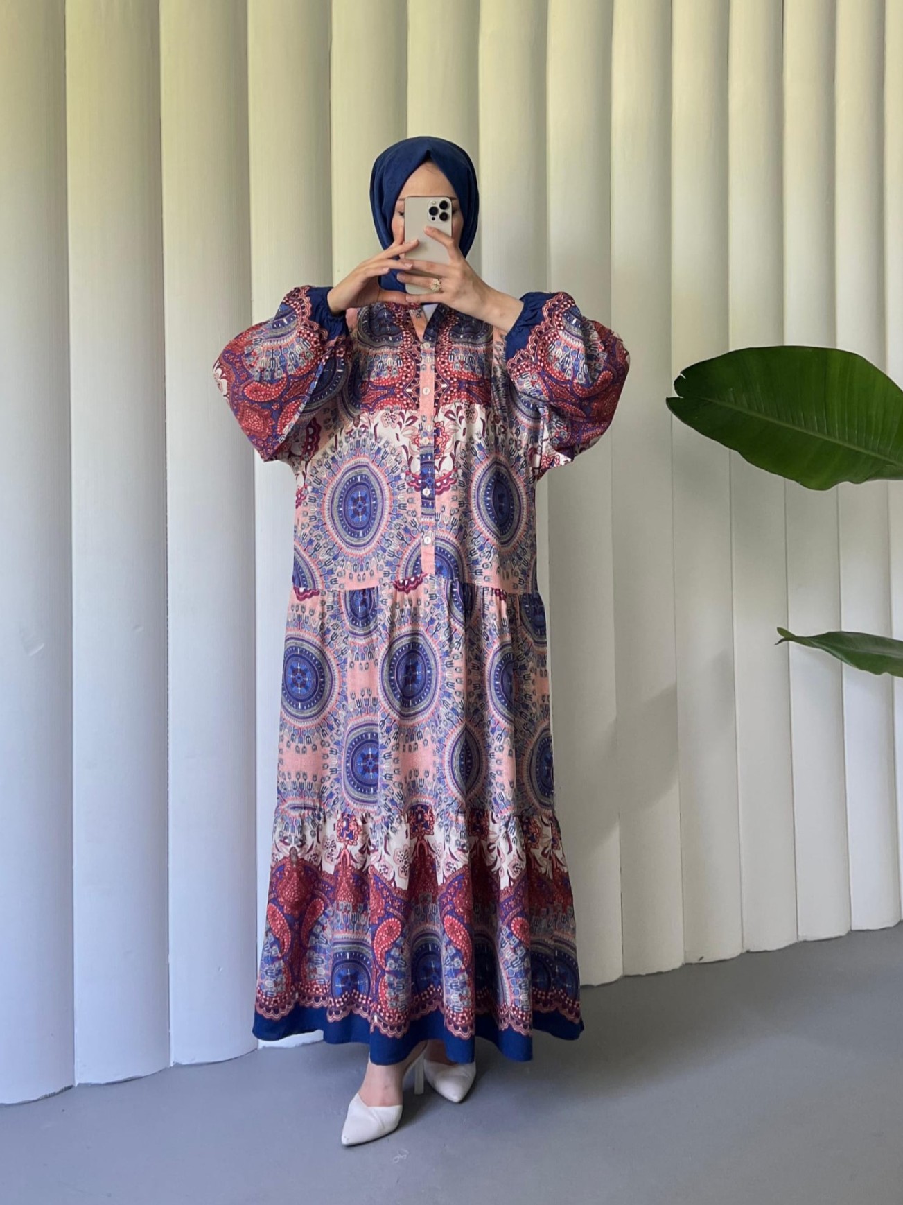 Dik Yaka Yarım Düğmeli Parçalı Elbise -Yavruağzı-Yavruağzı
