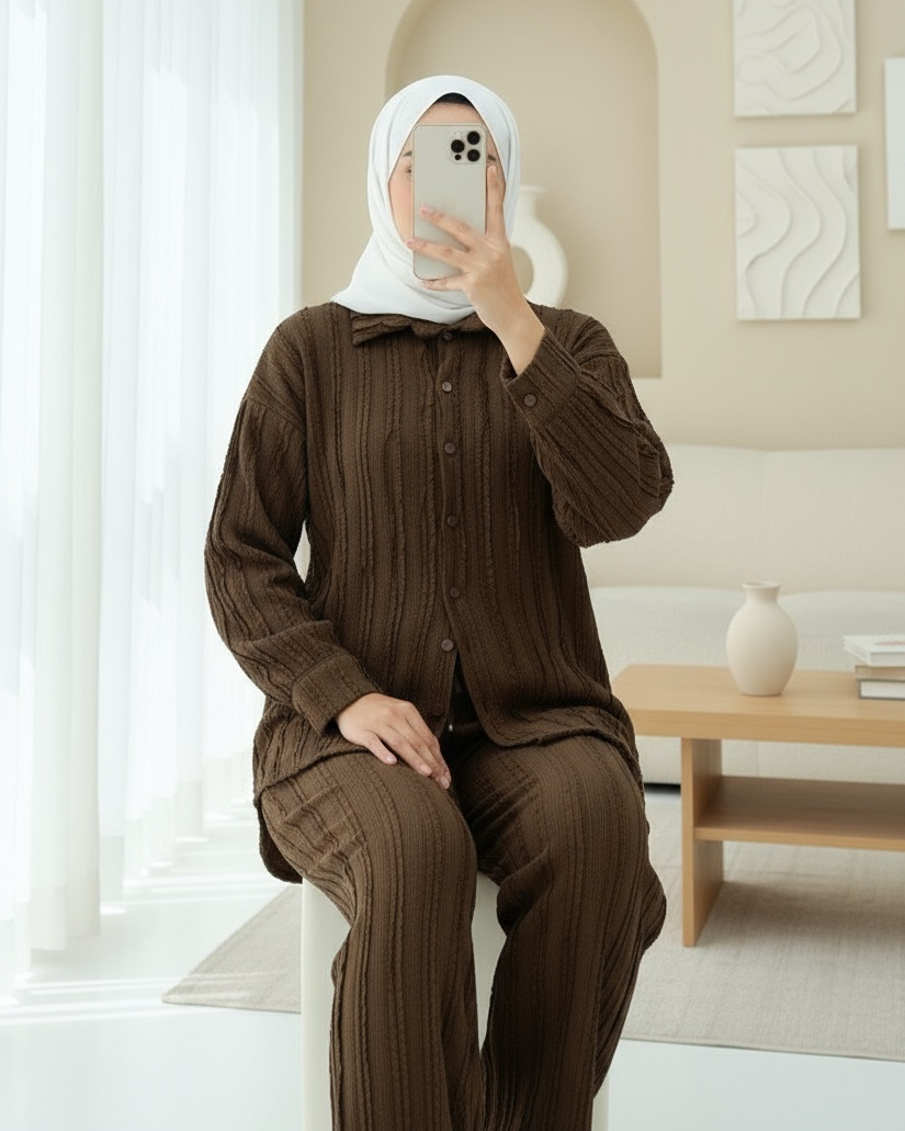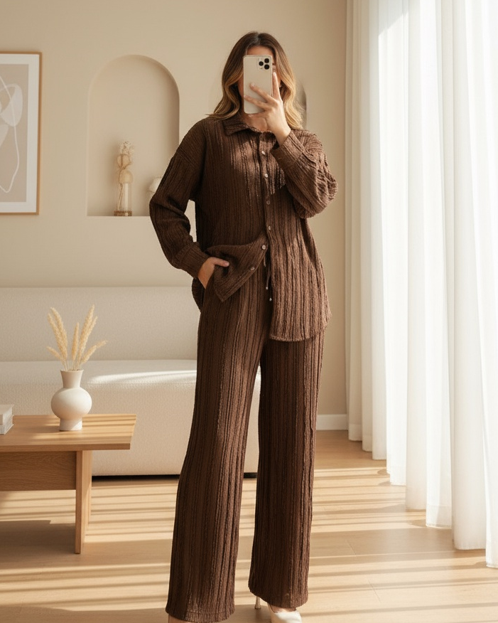Dokulu Düğmeli Dikey Şeritli Pantolon Gömlek Takım -Kahve-Kahve