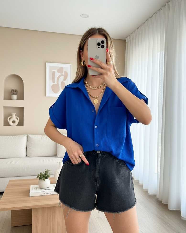 Duble Kol Tek Cepli Bürümcük Gömlek -Saks-Saks