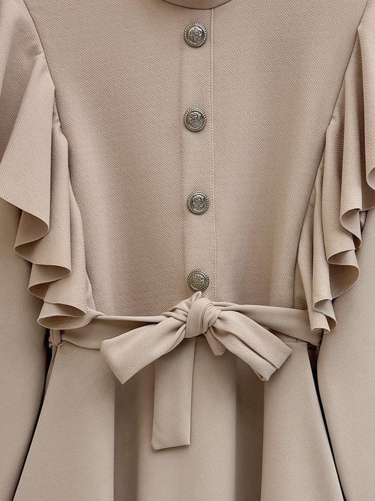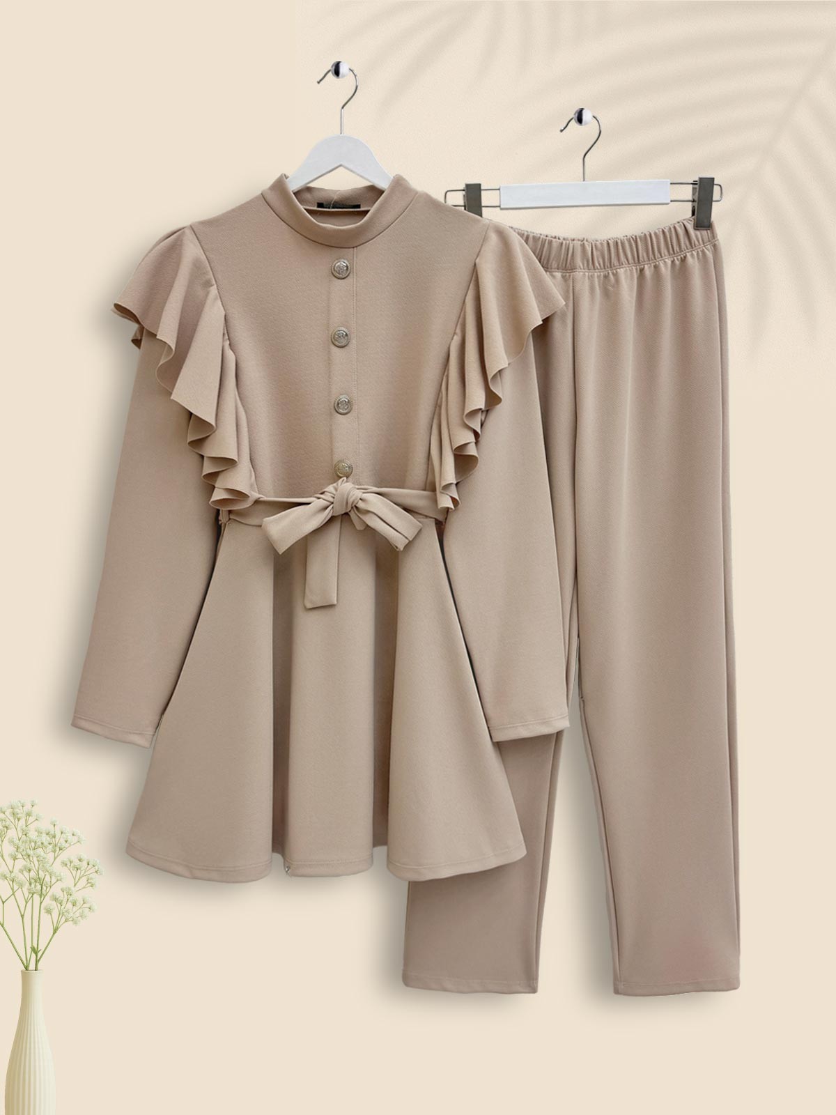 Düğme Detaylı Omuzu Fırfırlı Takım -Bej-Bej