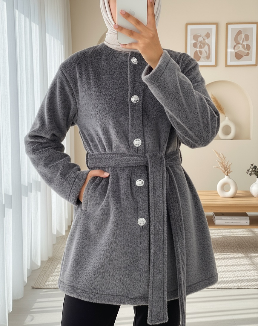 Düğmeli Beli Bağlamalı Kürklü Ceket -Füme-Füme
