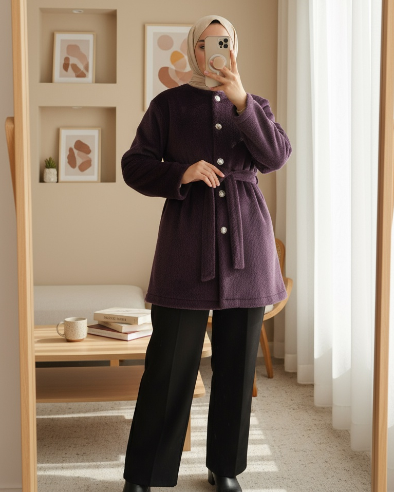 Düğmeli Beli Bağlamalı Kürklü Ceket -Mürdüm-Mürdüm