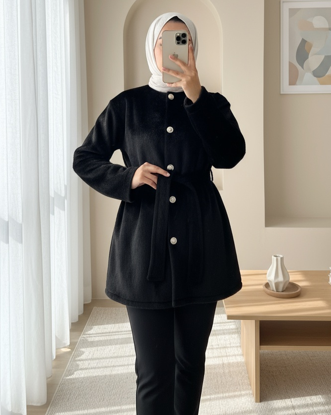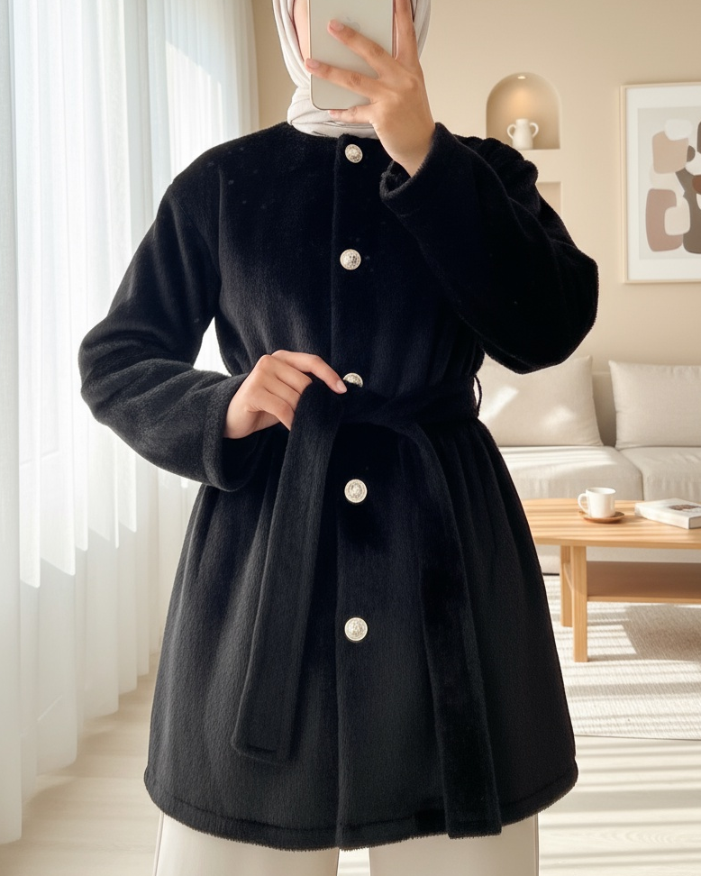 Düğmeli Beli Bağlamalı Kürklü Ceket -Siyah-siyah