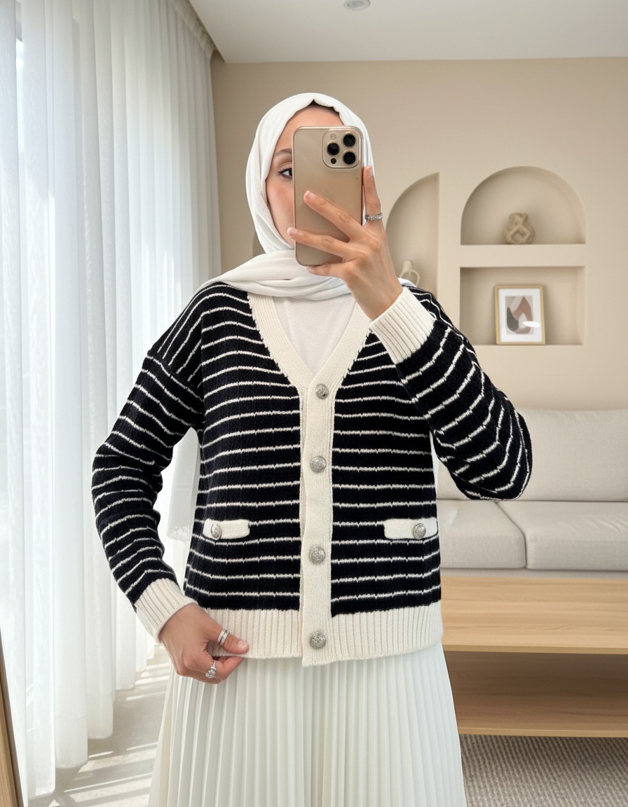 Düğmeli Cep Detaylı İnce Çizgili Triko Hırka -Krem-Krem