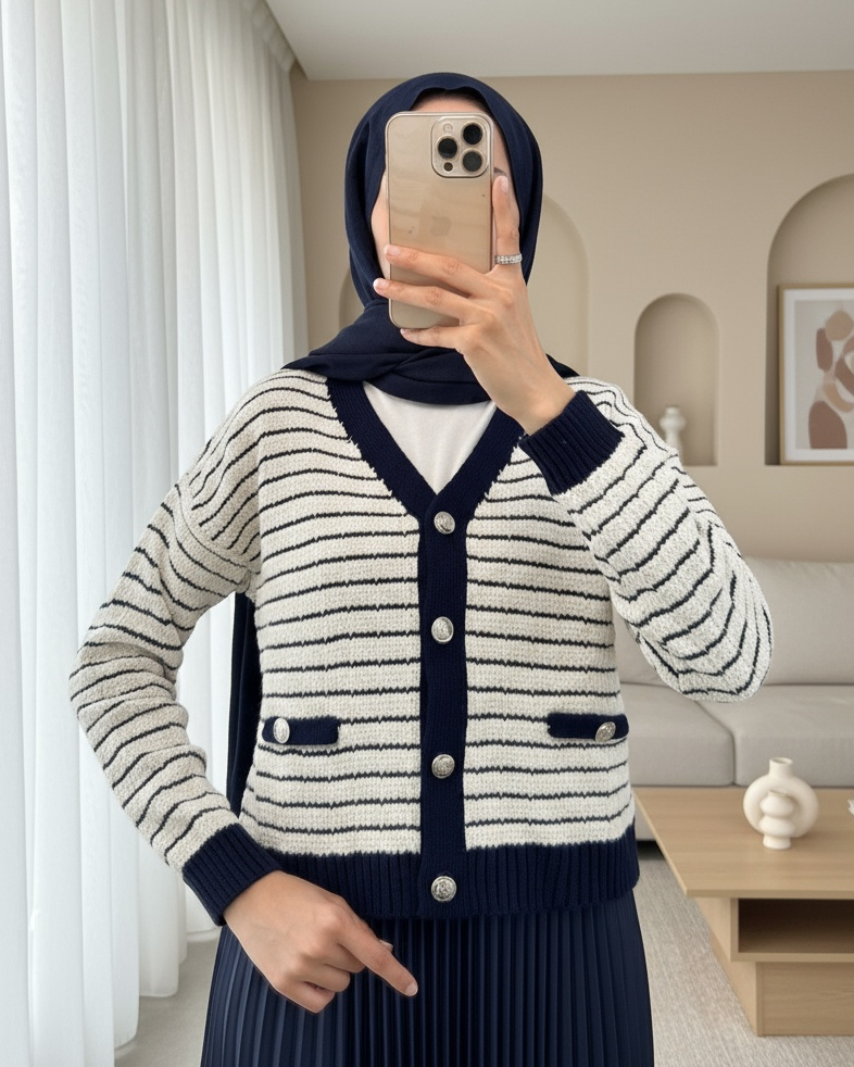 Düğmeli Cep Detaylı İnce Çizgili Triko Hırka -Laci-Lacivert