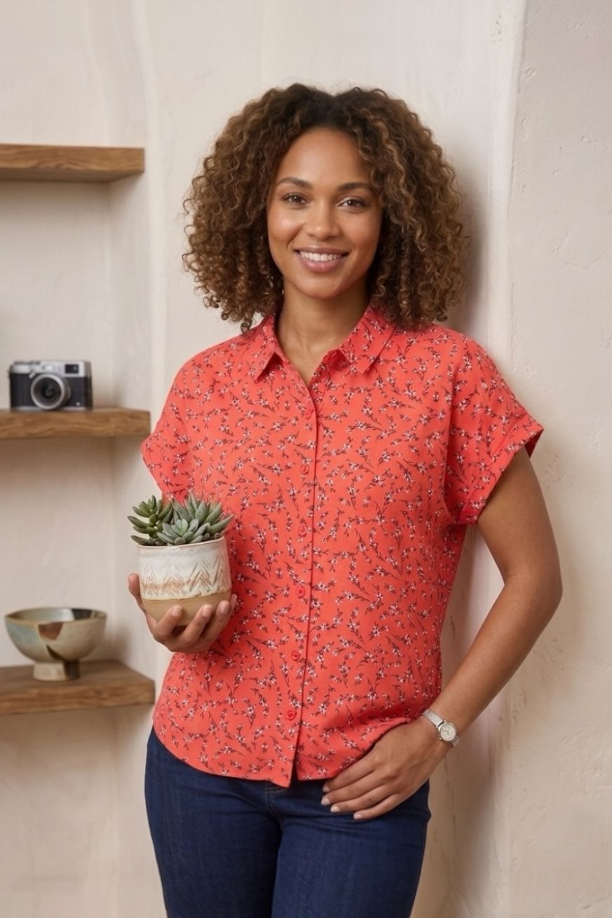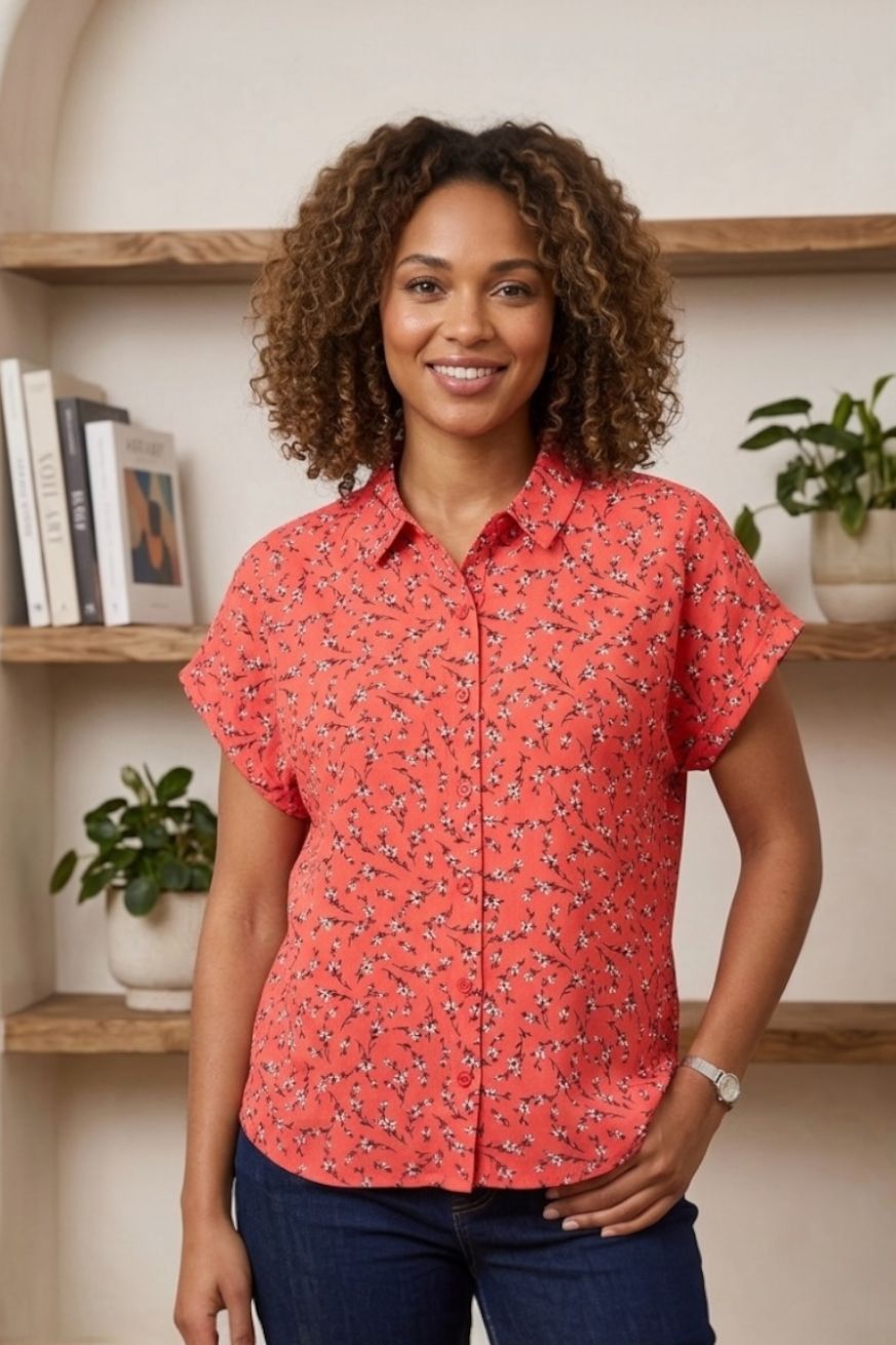 Düğmeli Çiçek Desenli Kısa Kol Gömlek Kırmızı - KK708-Somon