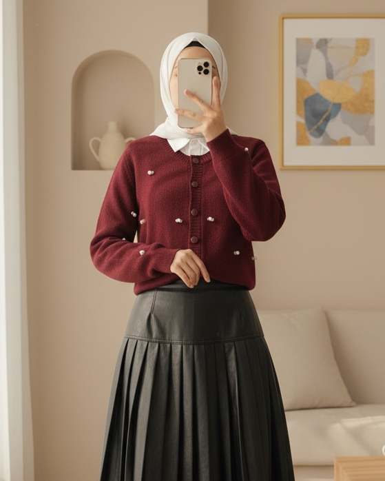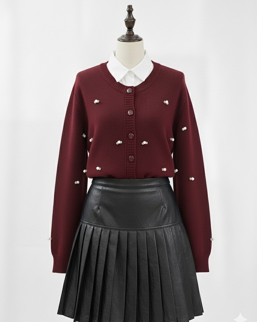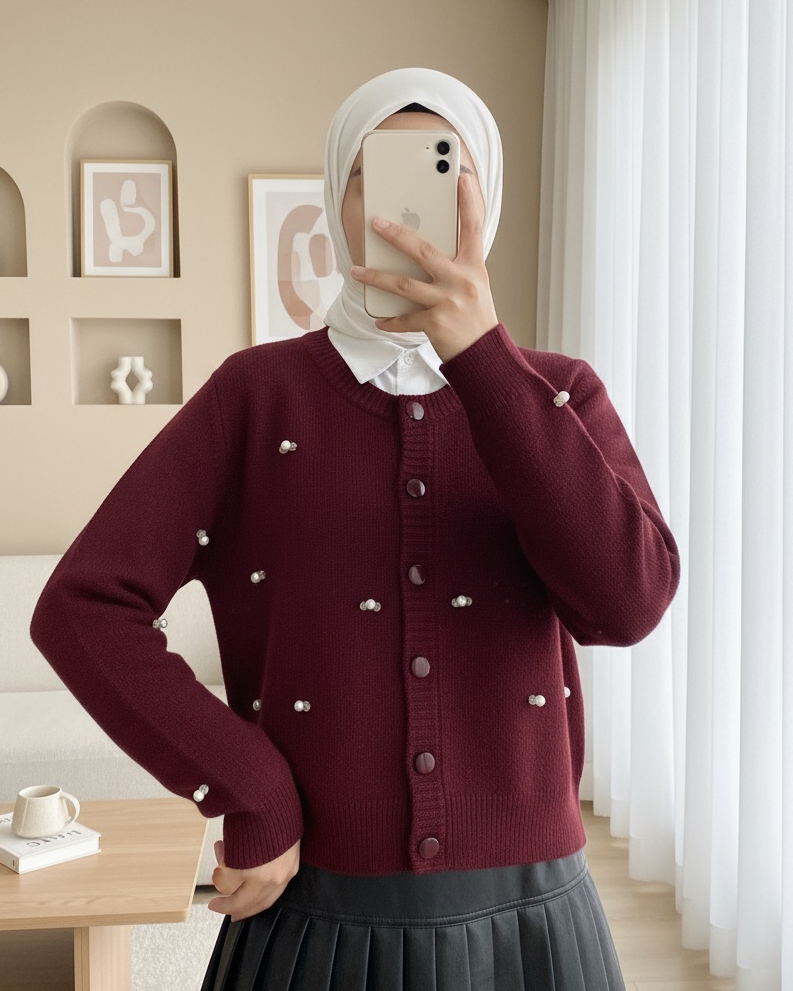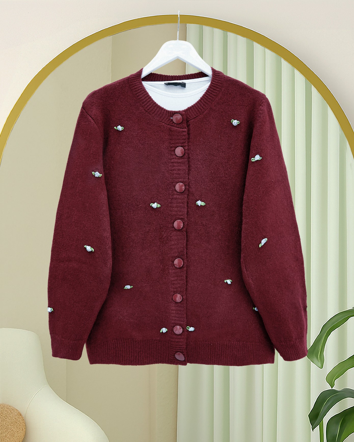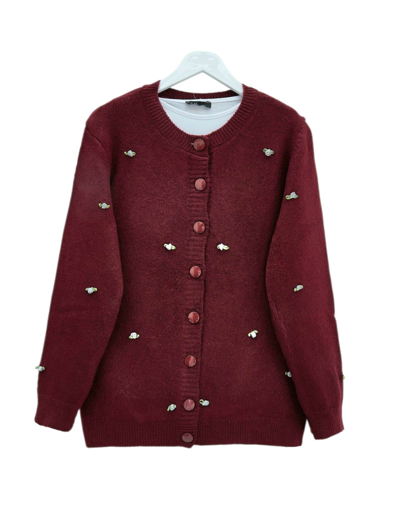 Düğmeli Çiçek Detaylı Yumoş Hırka -Bordo-Bordo