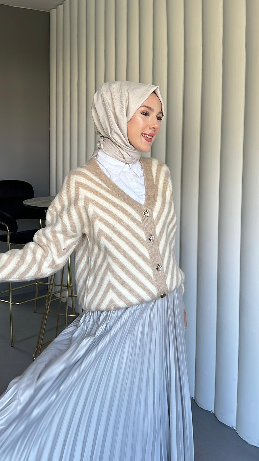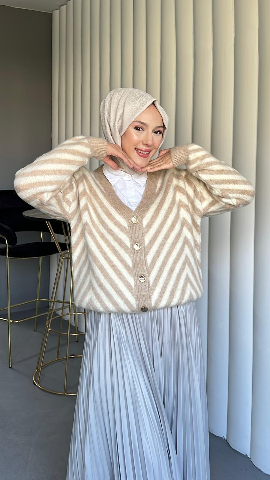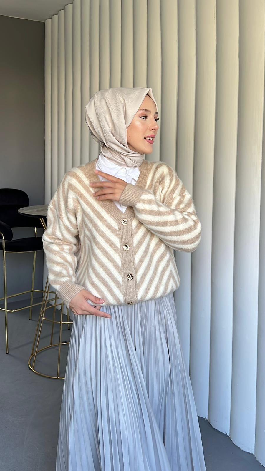 Düğmeli Çizgili Sakallı Hırka -Krem-Krem