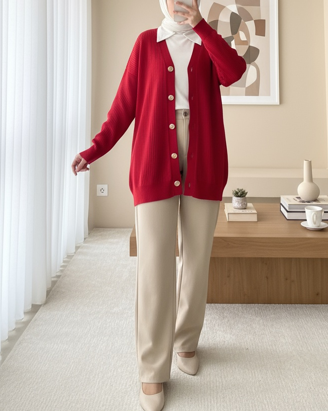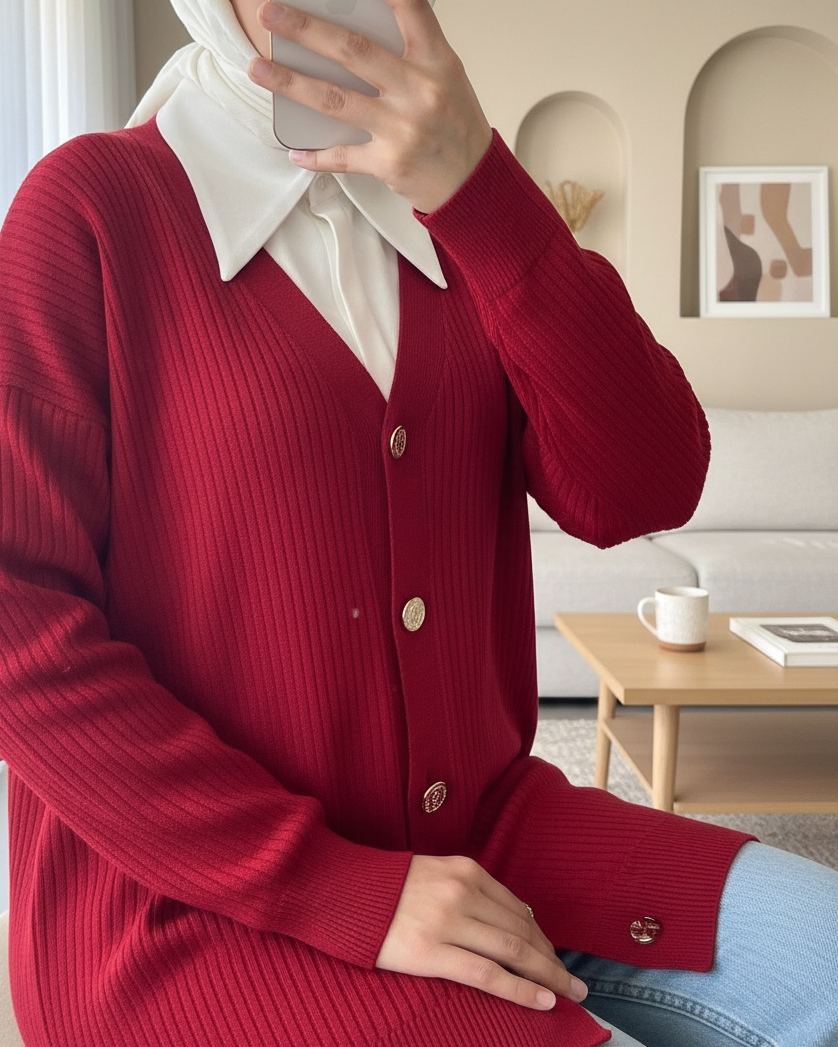 Düğmeli Fitilli Triko Hırka -Kırmızı-Kırmızı