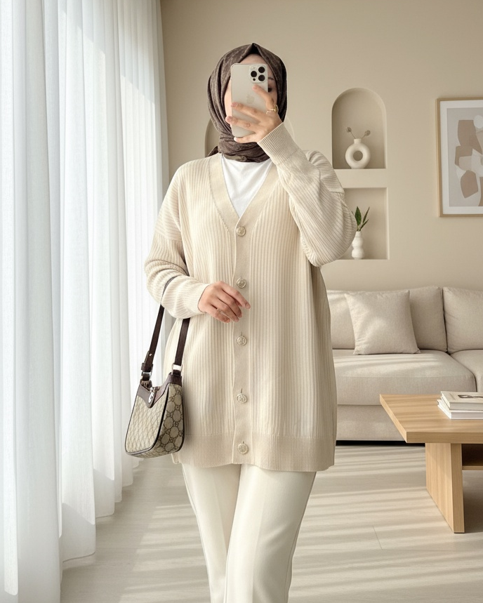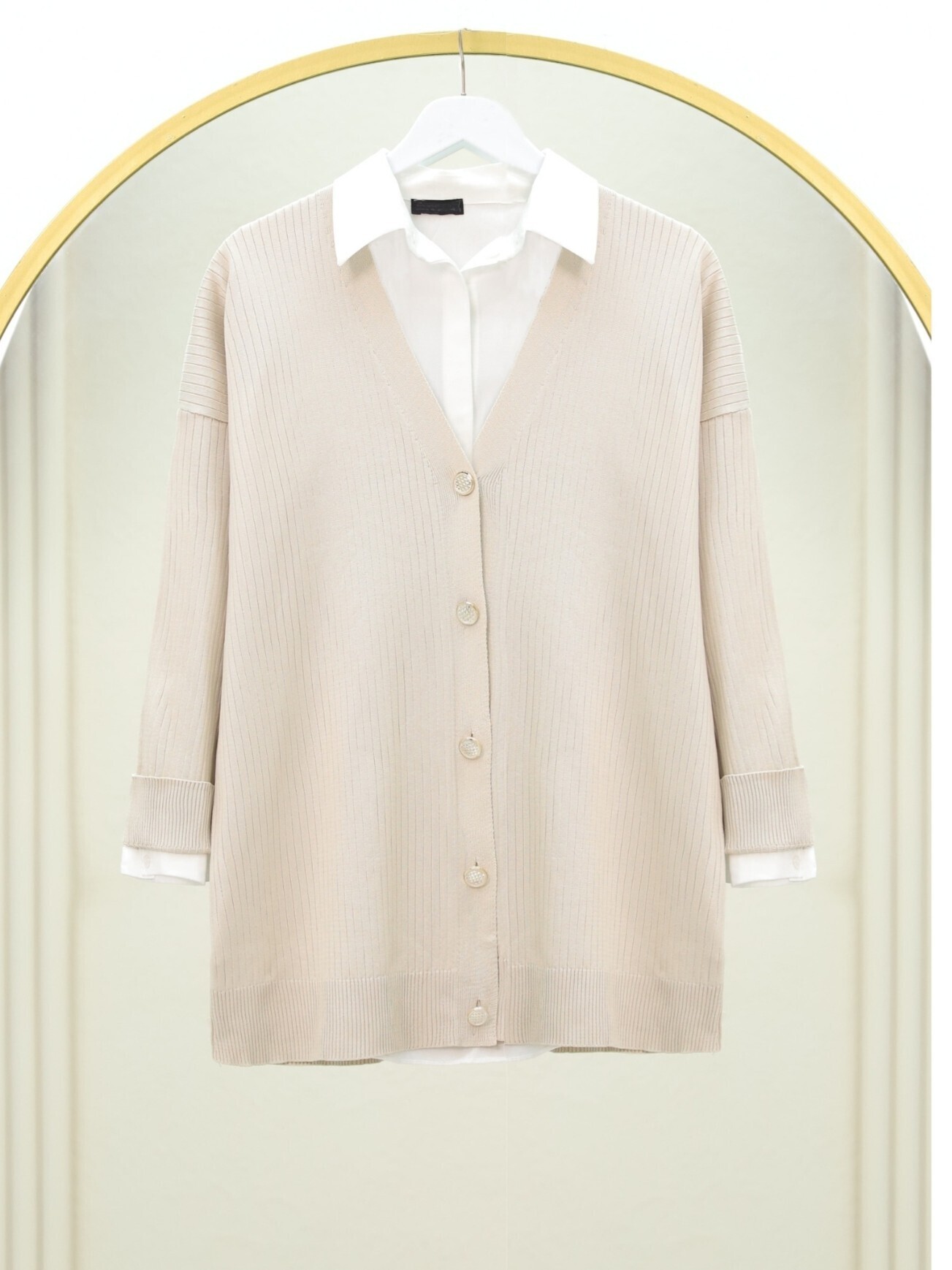 Düğmeli Fitilli Triko Hırka -Krem-Krem