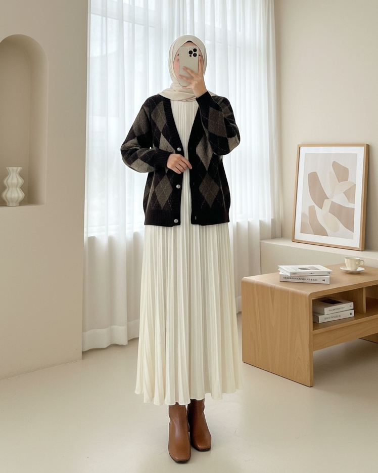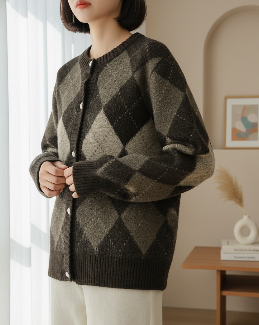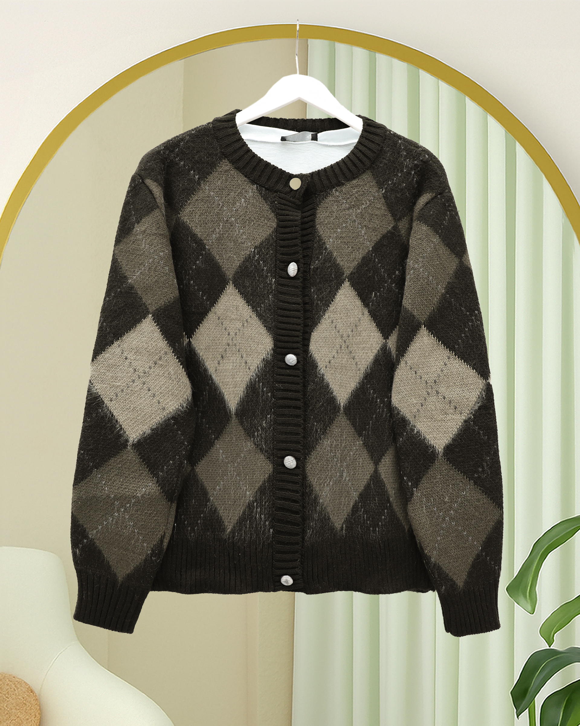 Düğmeli Kare Desenli Çift Kat Triko Hırka -K. Kahve-K. Kahve