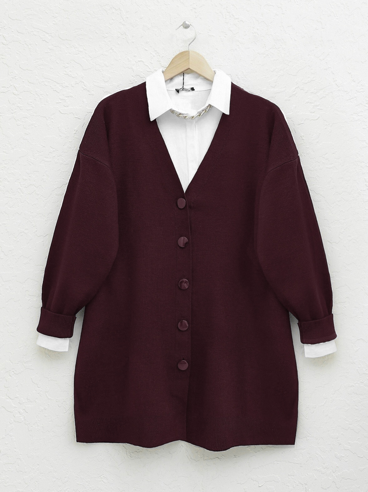 Düğmeli Kışlık Tesettür Triko Hırka -Bordo-Bordo