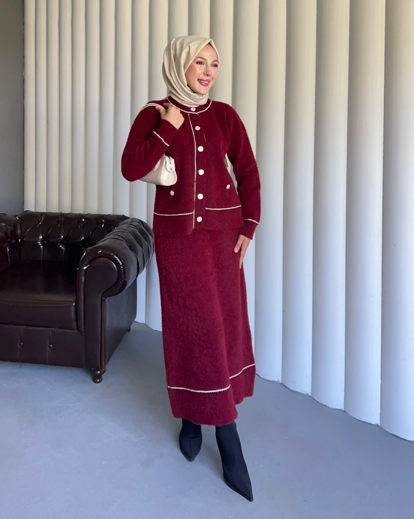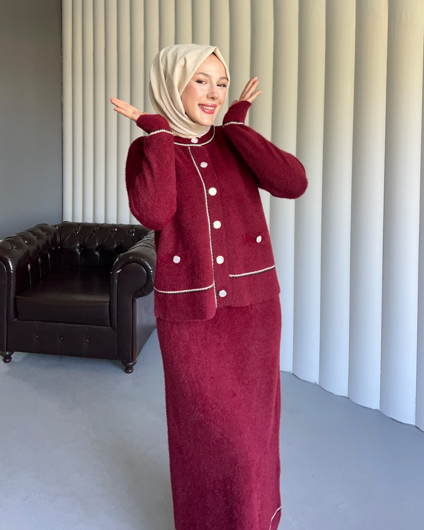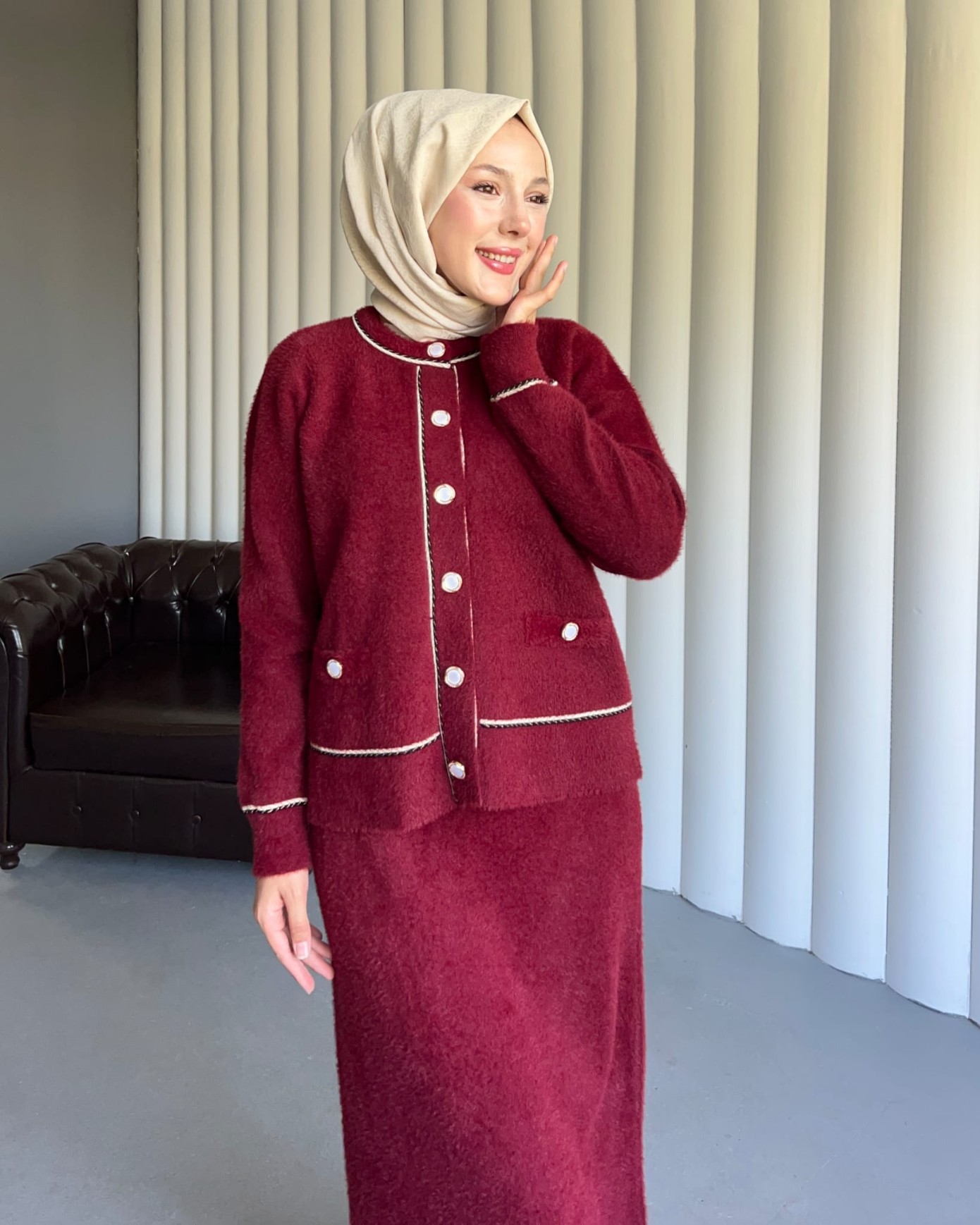 Düğmeli Şerit Detaylı Sakallı Yumoş Takım -Bordo-Bordo